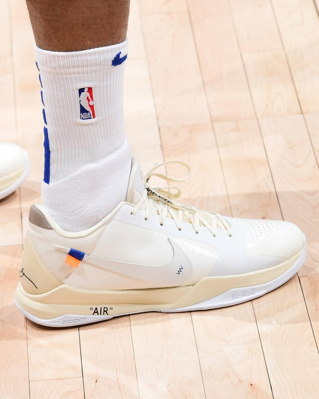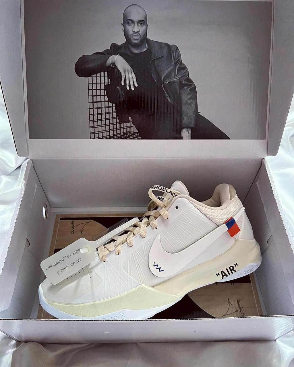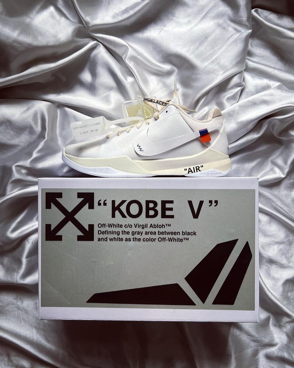 可以看到,整双鞋以 Nike Kobe 5 Protro 为基础,融入大量 OFF-WHITE、THE 10 元素,简直帅炸。