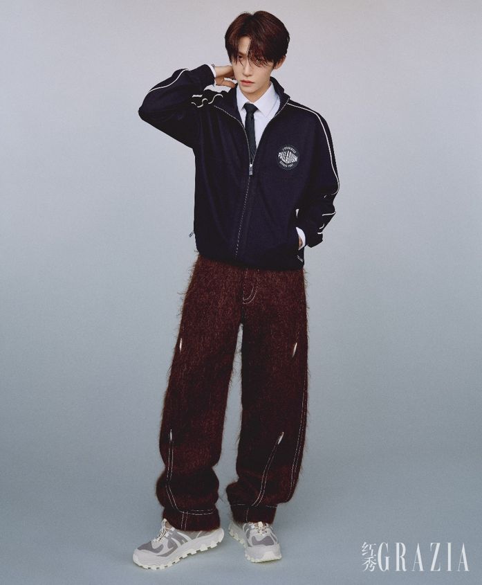 同样为男团偶像的刘宇也交出了自己的答卷,开衫运动服 + 白色衬衫领带配合鲨齿鞋,复古校园风立马展现。