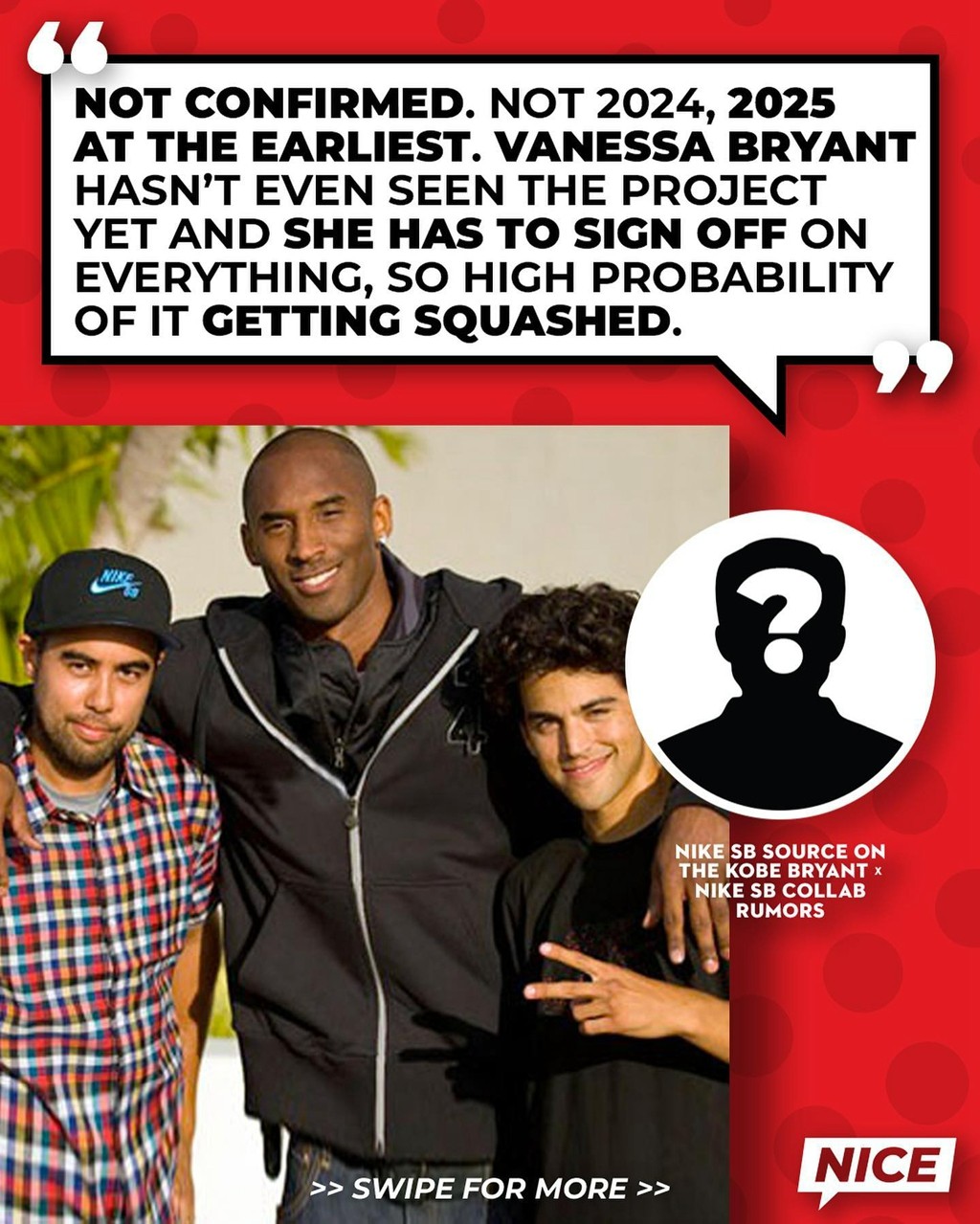 他表示,Kobe 系列相关事务现在决定权全部在科比妻子瓦妮莎那里,而她目前还没见到 Nike SB x Kobe 的样品。