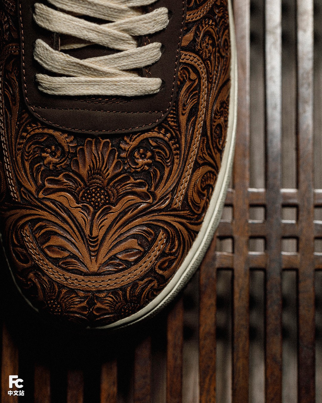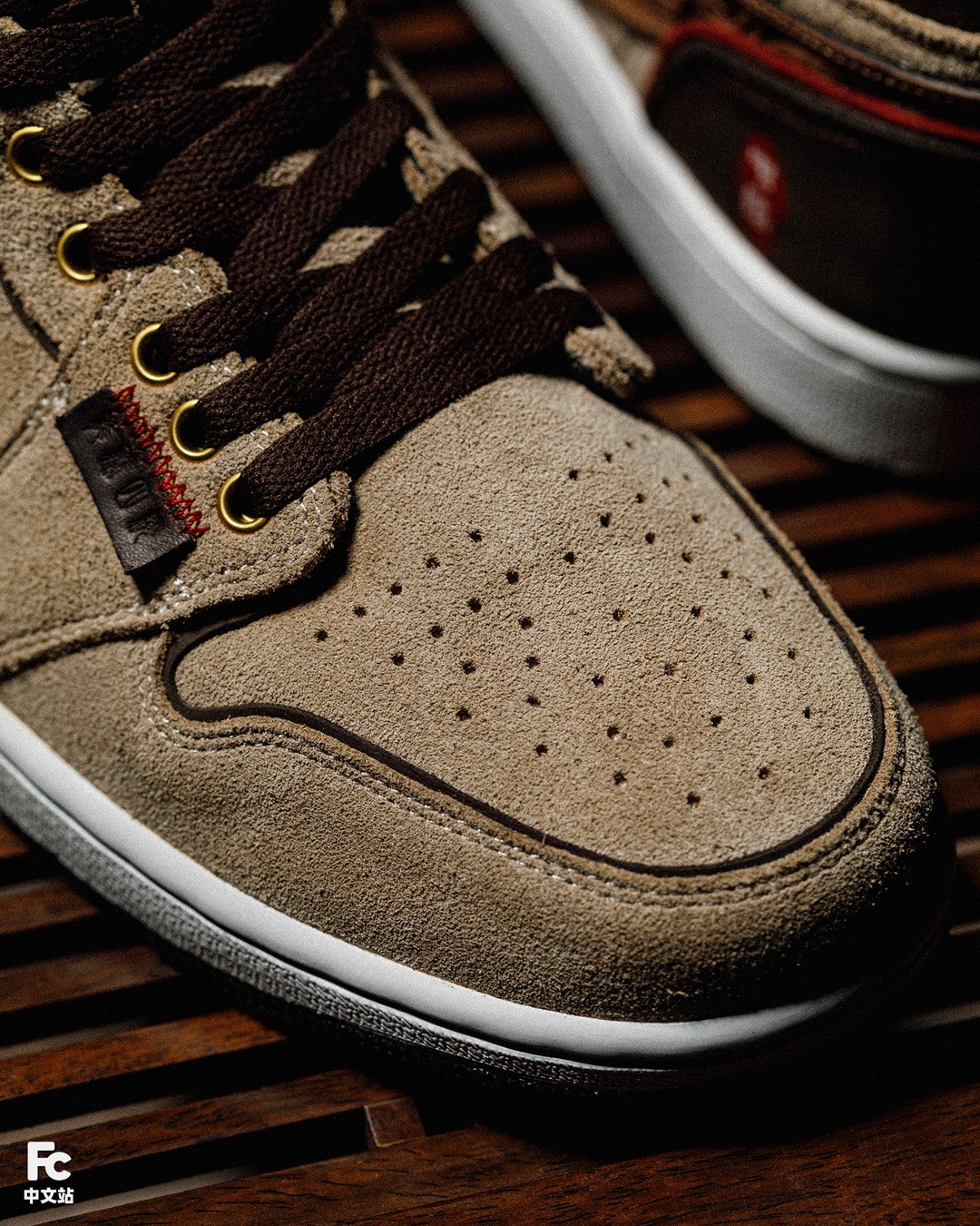 而鞋面的色彩,也不单单是咱们肉眼看见的棕色、木色这么简单,根据 FZBB 的说法,这种颜色叫 “燃茶色”。