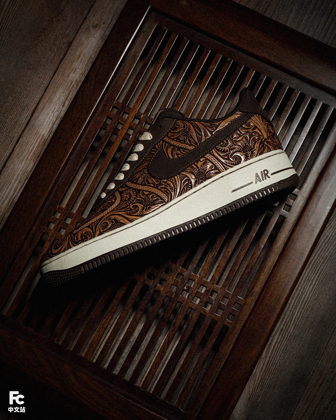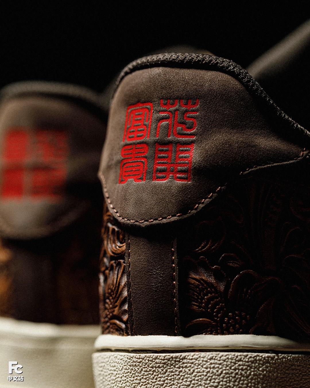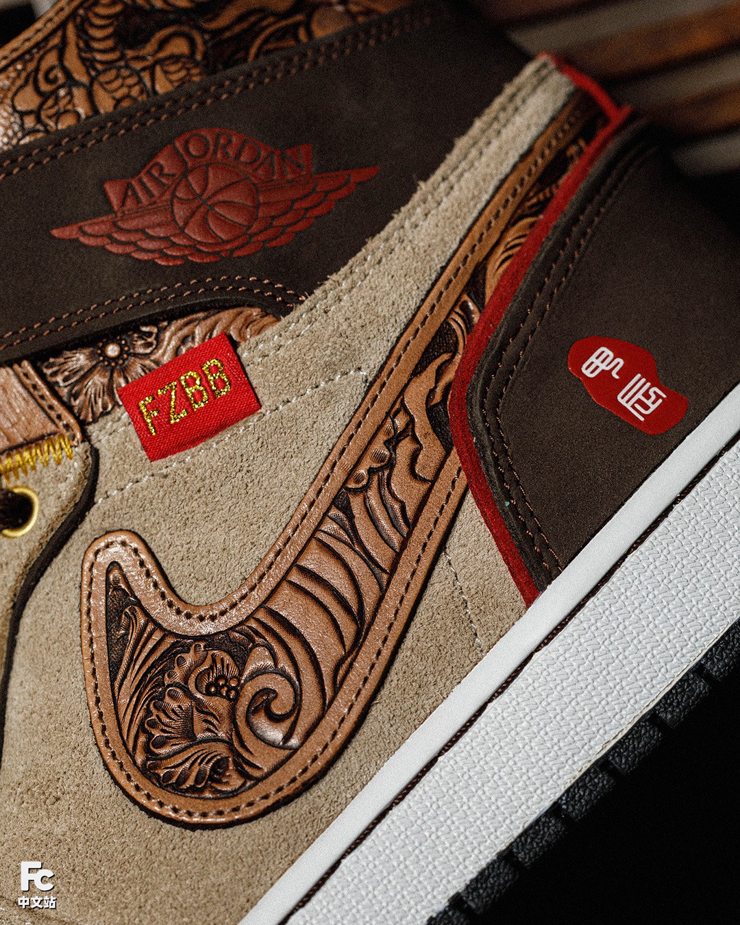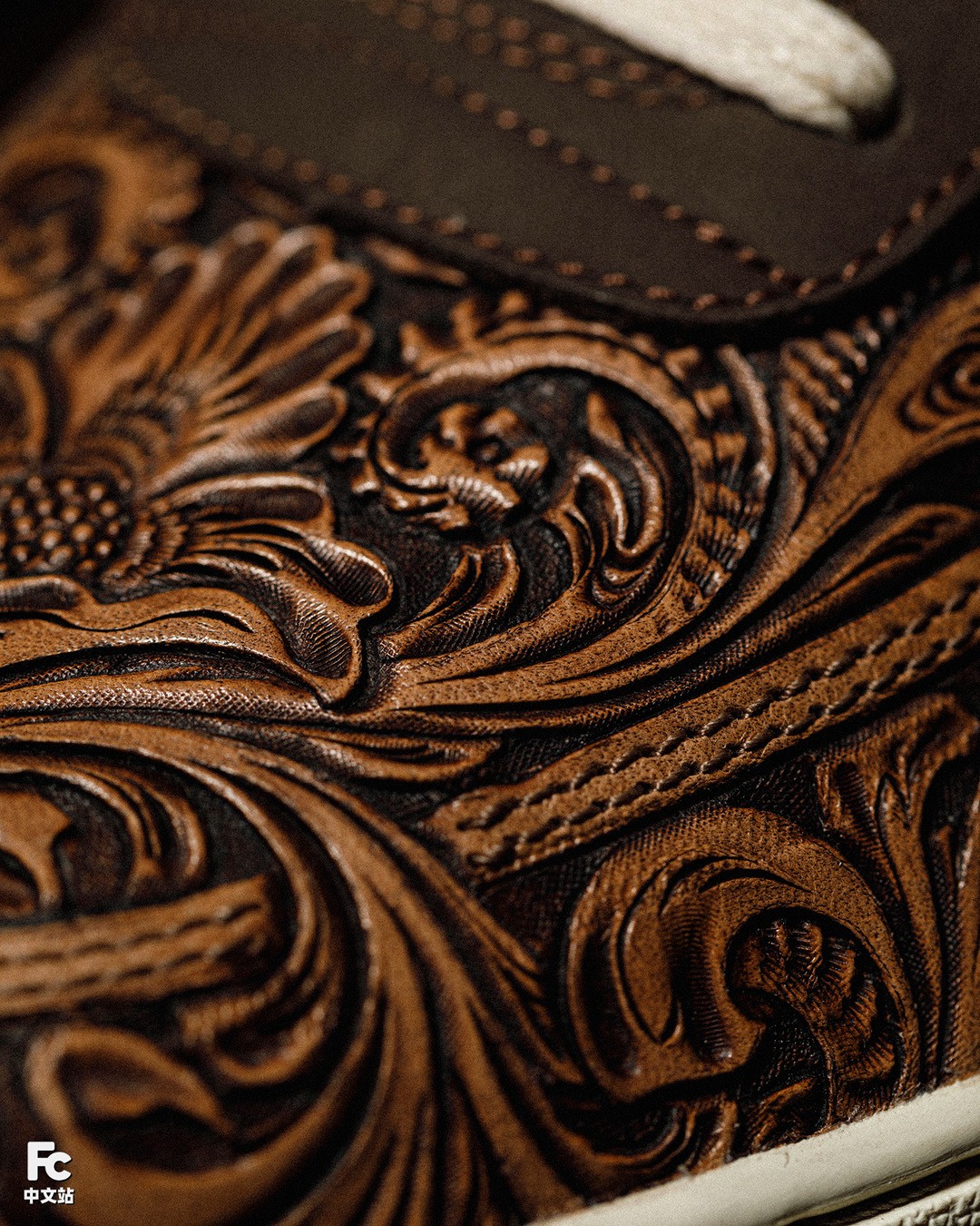 目光转向 Swoosh 处,这次 FZBB 使用了传统但又精致的皮雕工艺进行定制,内部则填充唐草图案。