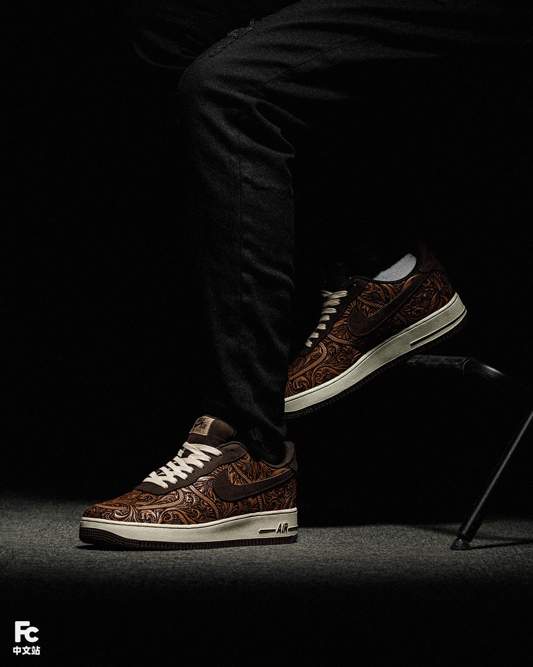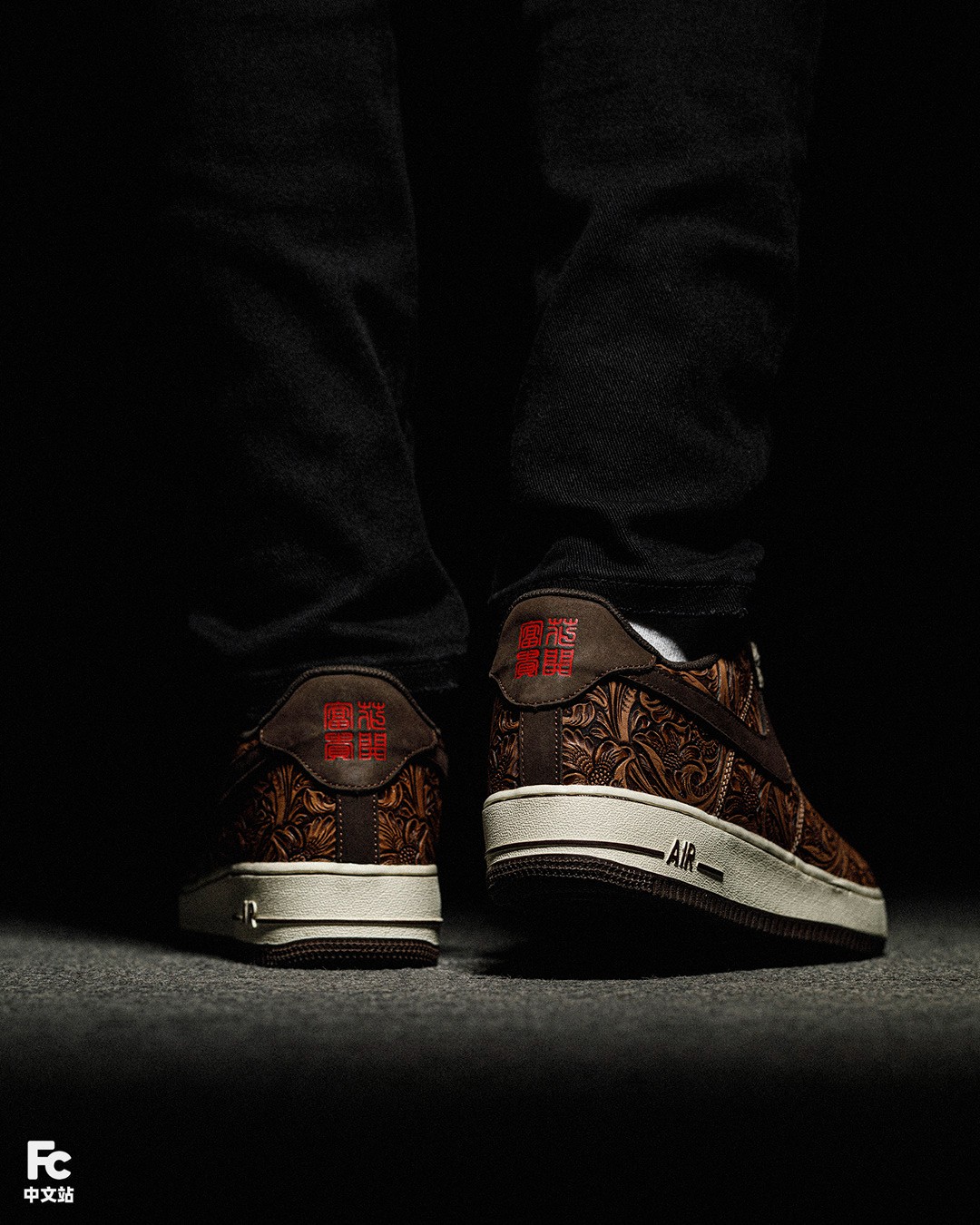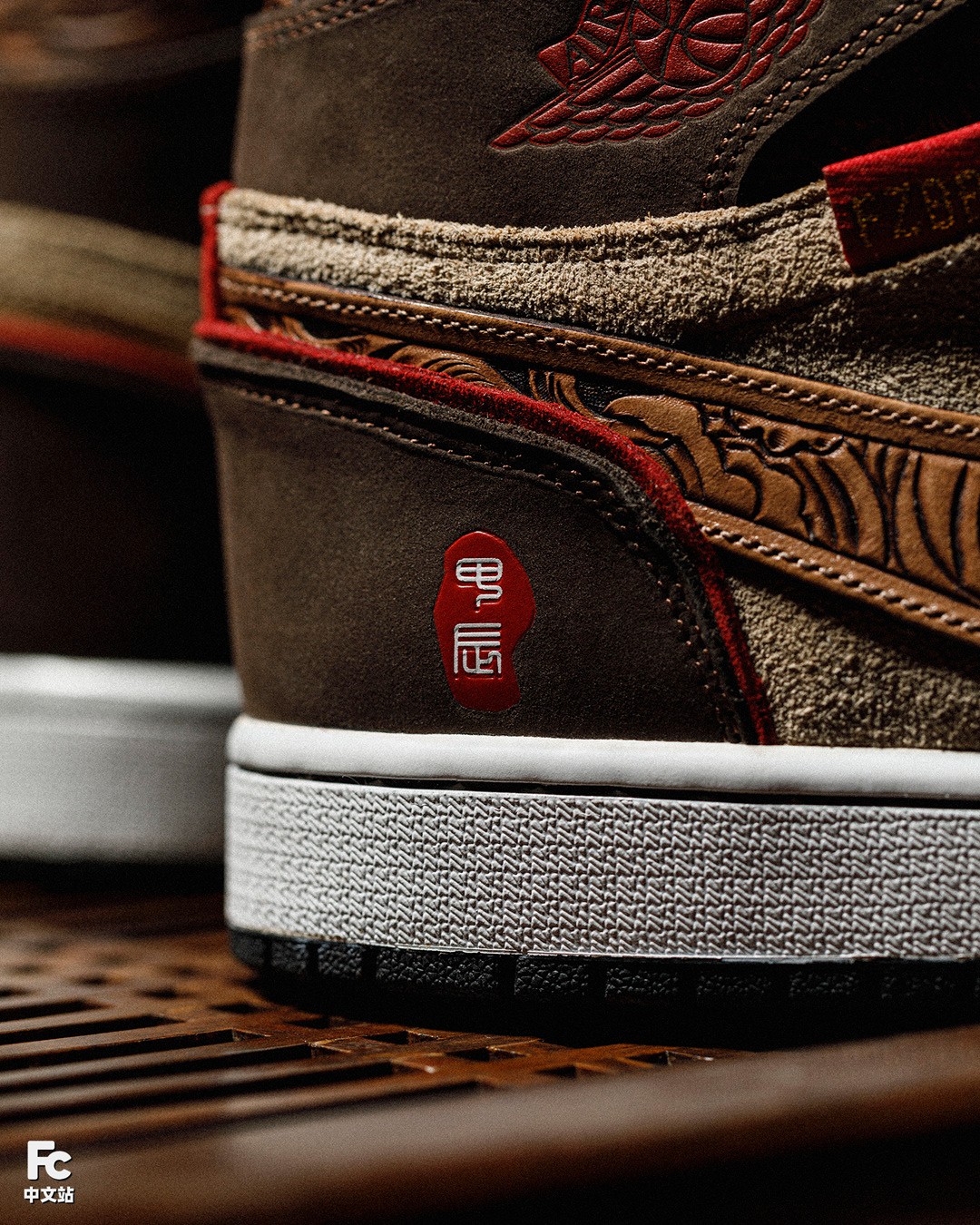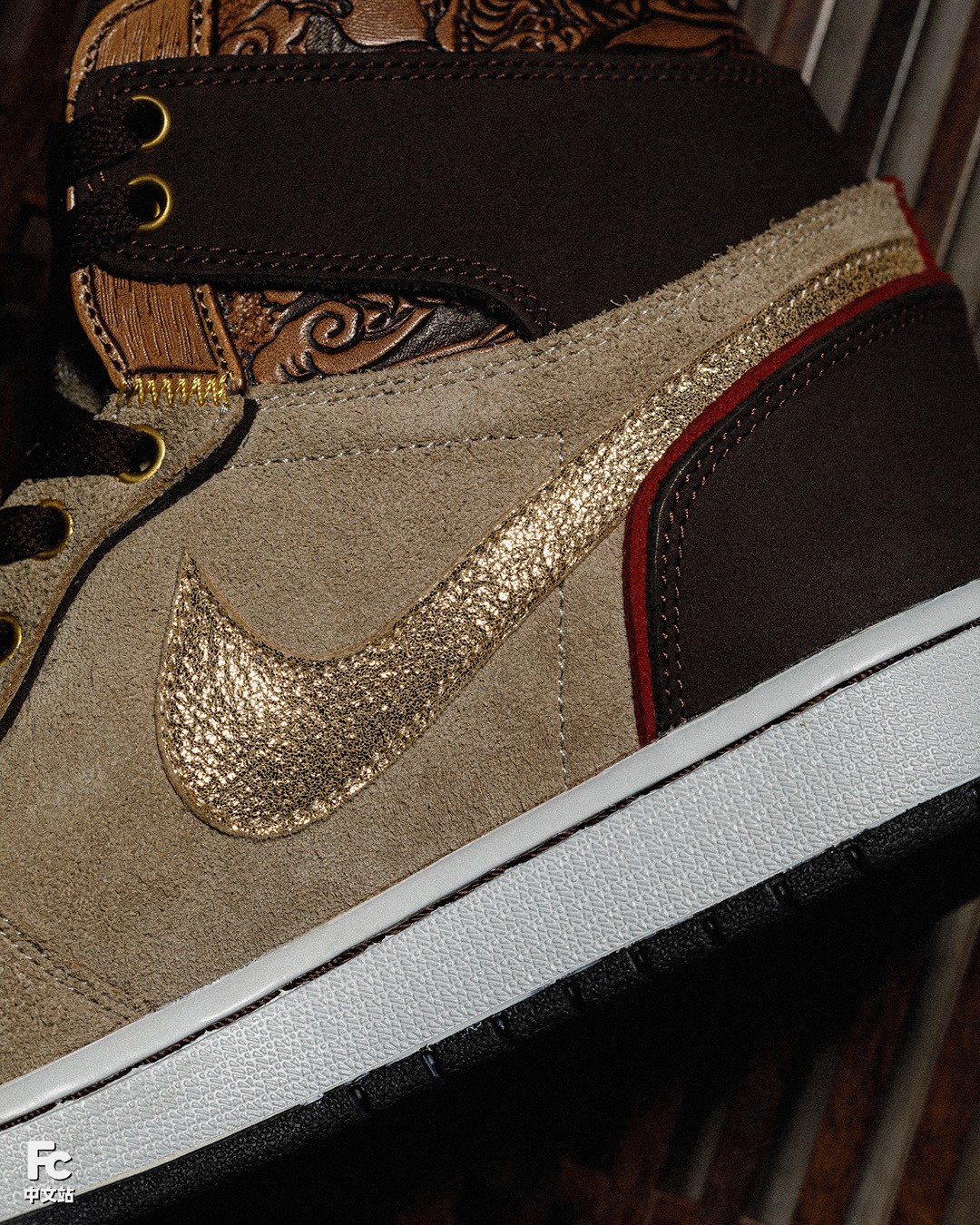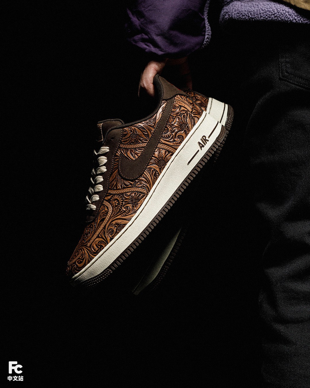 目光转向 Swoosh 处,这次 FZBB 使用了传统但又精致的皮雕工艺进行定制,内部则填充唐草图案。