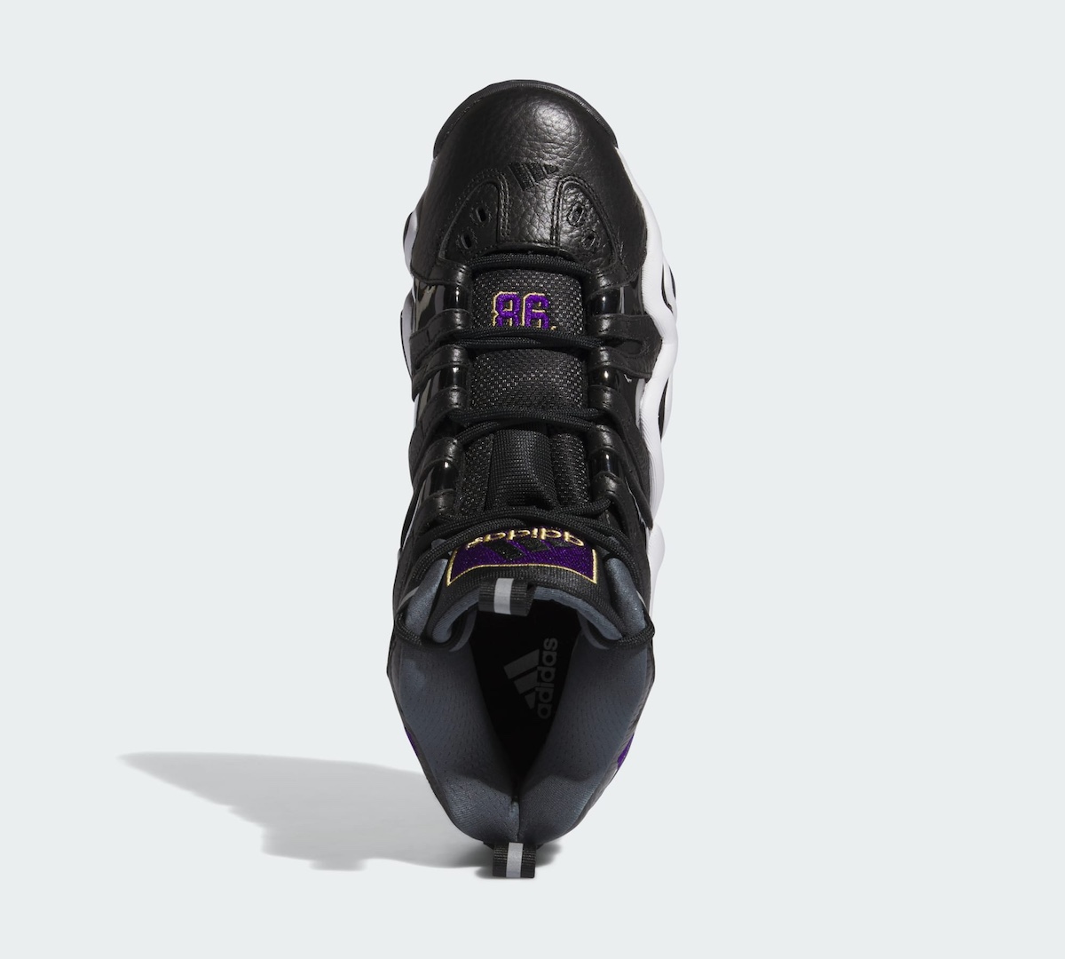 整体大面积黑色搭配白色覆面,紫金鞋舌点缀,还原湖人球衣配色。