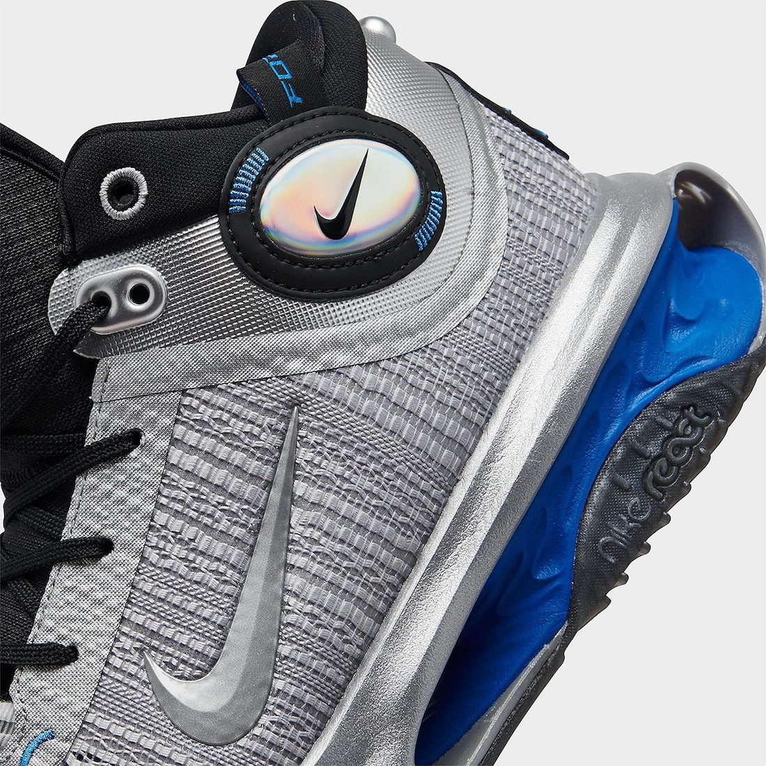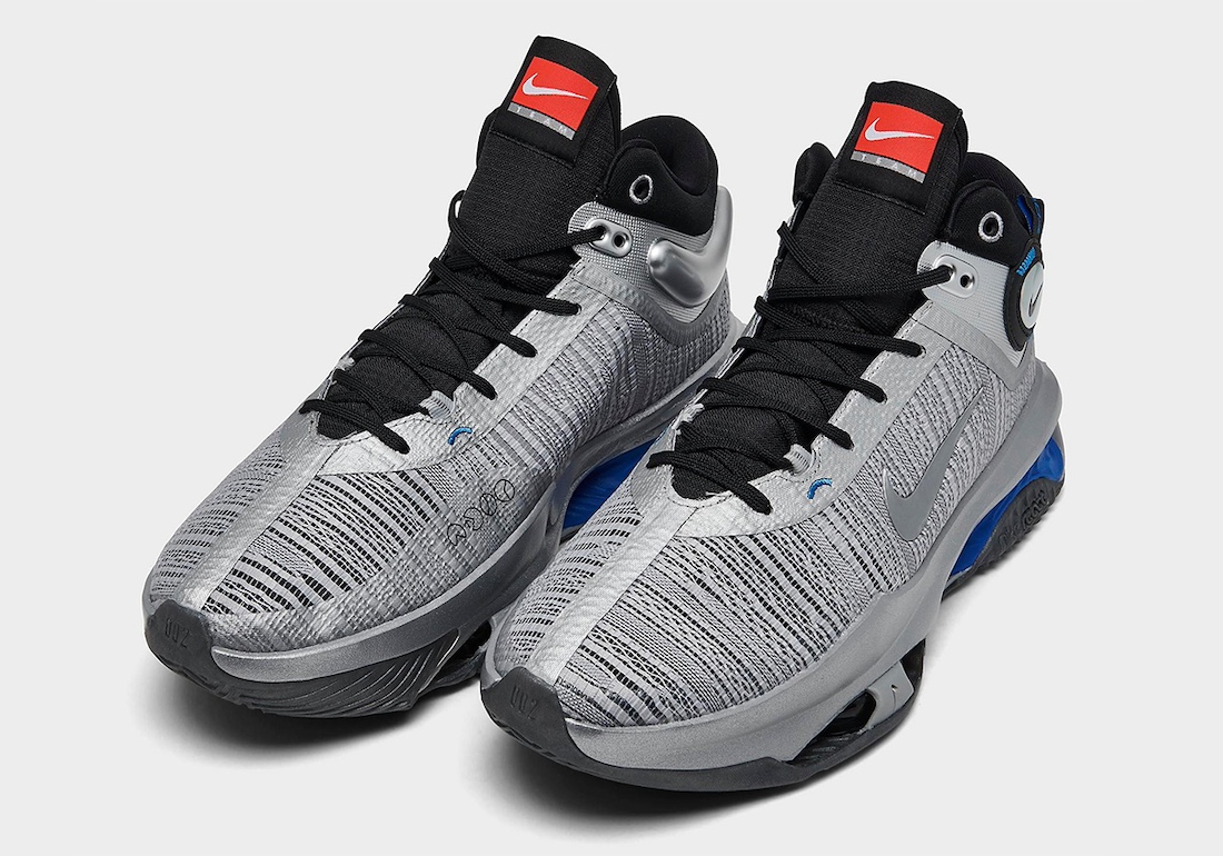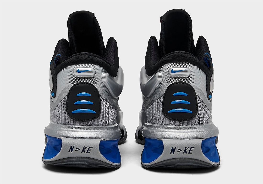 在 G.T. Jump 2 上采用「钢铁」深入人心的银、黑、蓝装扮,脚踝处幻彩的 Nike Swoosh 和后跟鞋提「雷派」的 FORCE 细节,都得以完美重现。