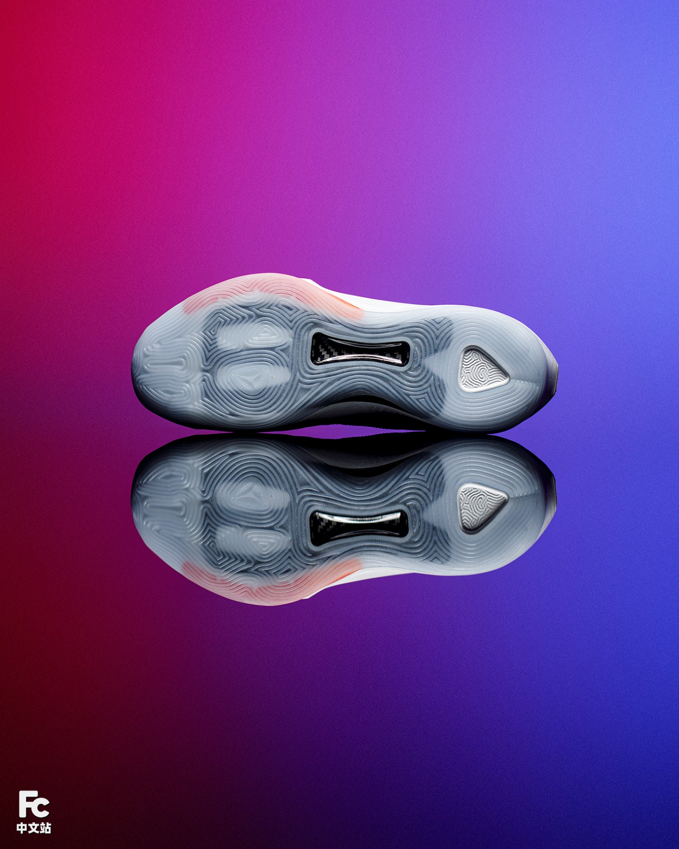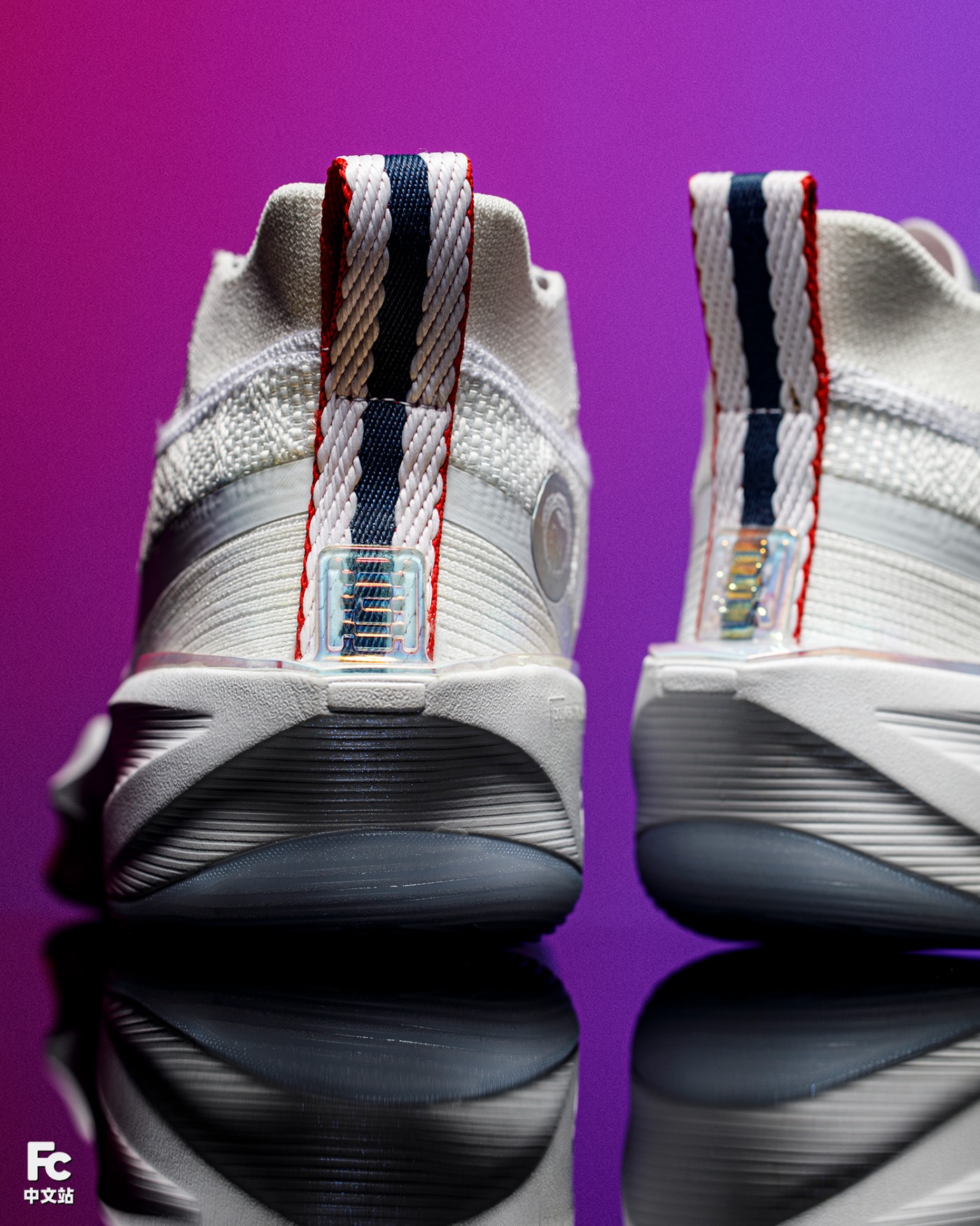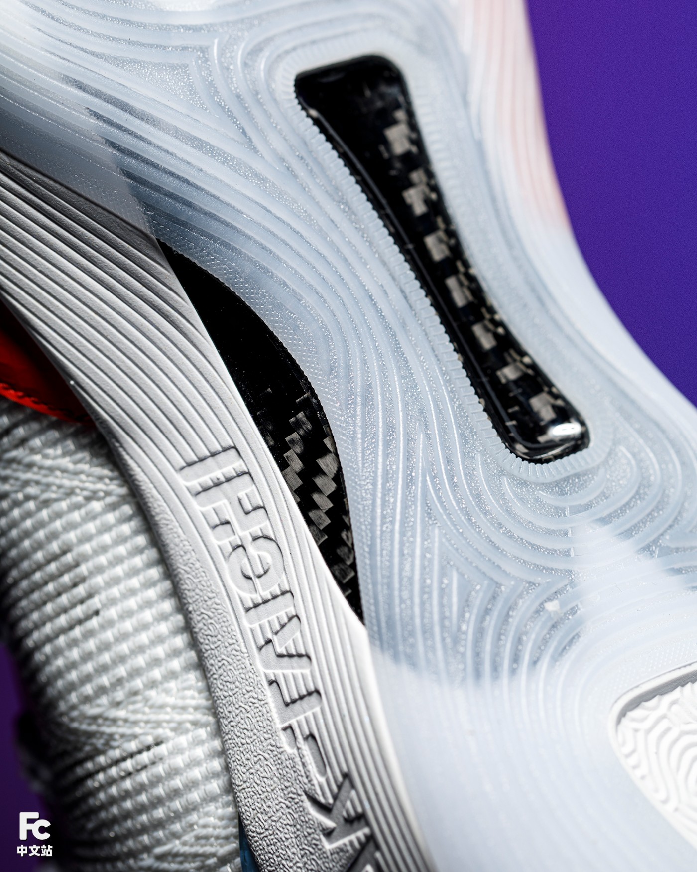 本次共有两个 TPU 片来辅助鞋款,前掌红色渐变 TPU 稳固防侧翻,后跟处的透明 TPU 配色港宝提供更好的稳定性。