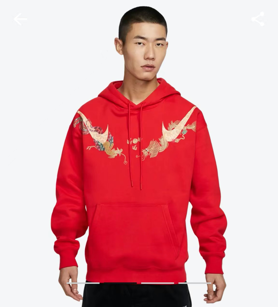 前胸是龙和凤图案结合 Swoosh 的造型,而后背则是醒目的「双囍」图案。