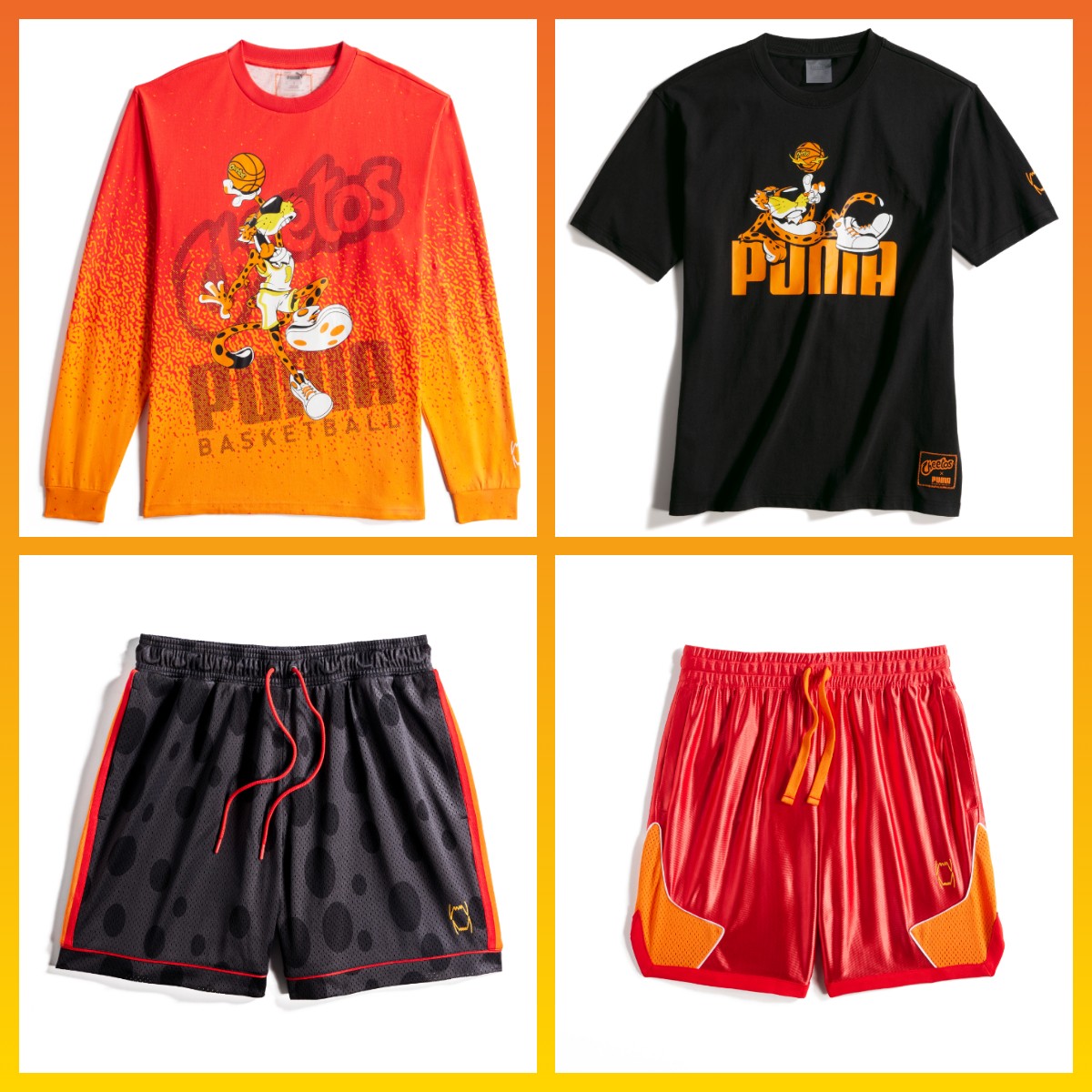 鞋身整体采用与奇多吉祥物猎豹切斯特 (Chester Cheetah) 一致的橘、黑装扮示人,标志性的黑色斑点涂装分布于鞋身两侧。