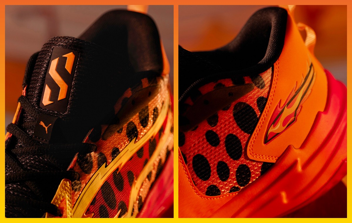 后跟内侧辅以火焰形状装饰,象征亨德森最爱的 "FLAMIN'HOT®" 热辣芝士口味,将亨德森劲爆球风与其最爱零食风味完美结合。