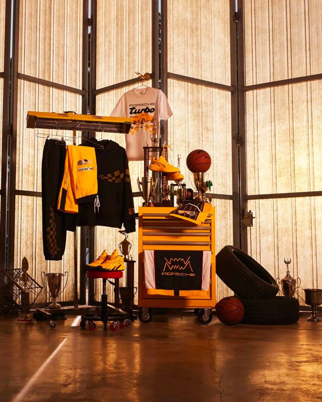 除此之外,联名系列还包含卫衣、夹克、运动长裤、短裤以及 T恤等服饰产品,同样采用黄色以及黑色作为主色,配合保时捷 911 Turbo 图案以及赛道方格旗等赛车风格的印花元素,与两双鞋款产品组成完美搭配。