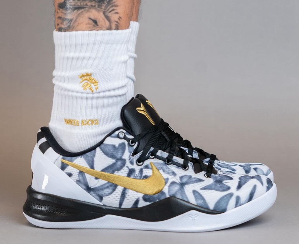 鞋面印满蝴蝶,黑、白搭配代表曼巴学院的球衣配色。