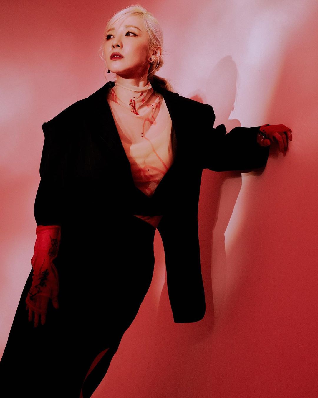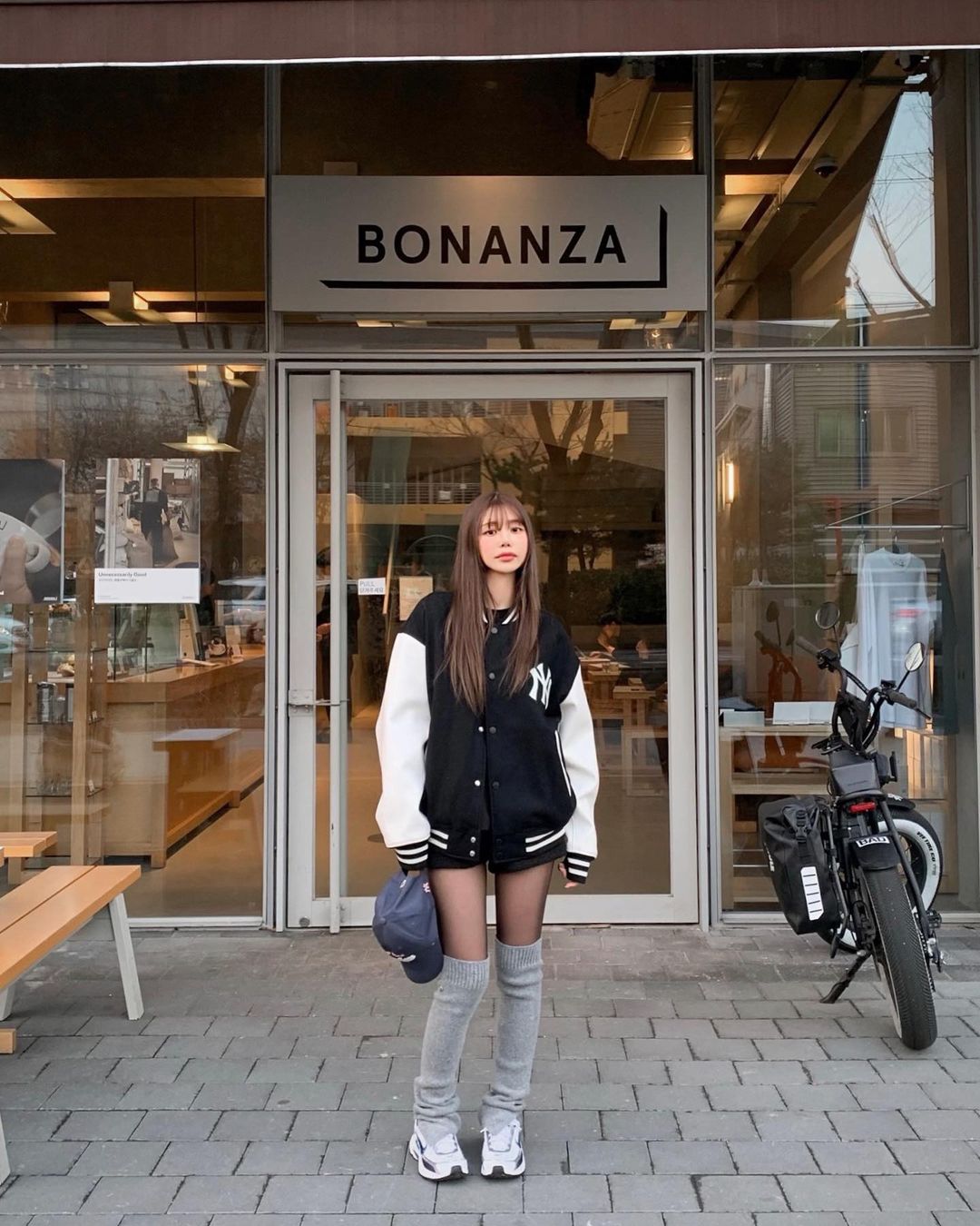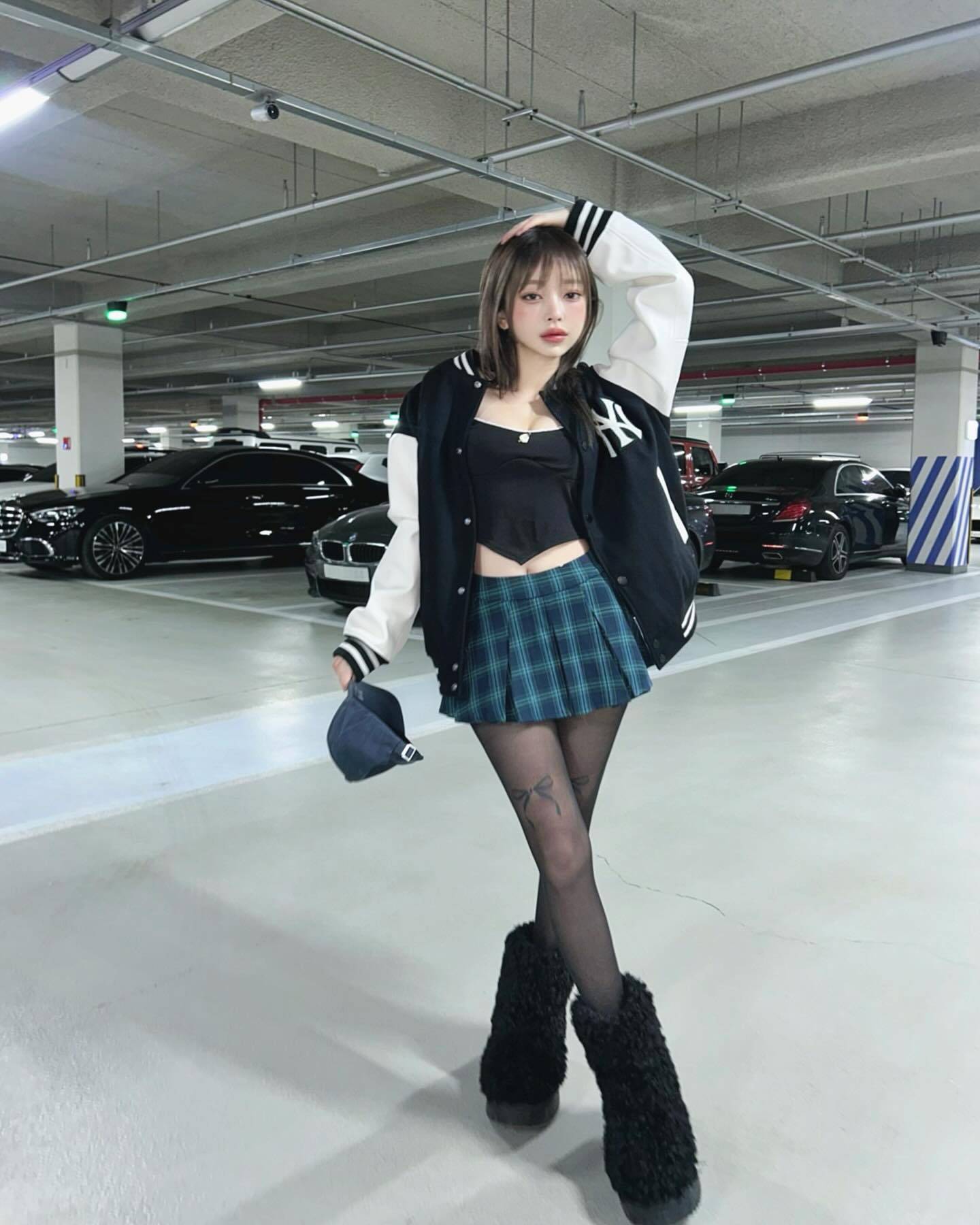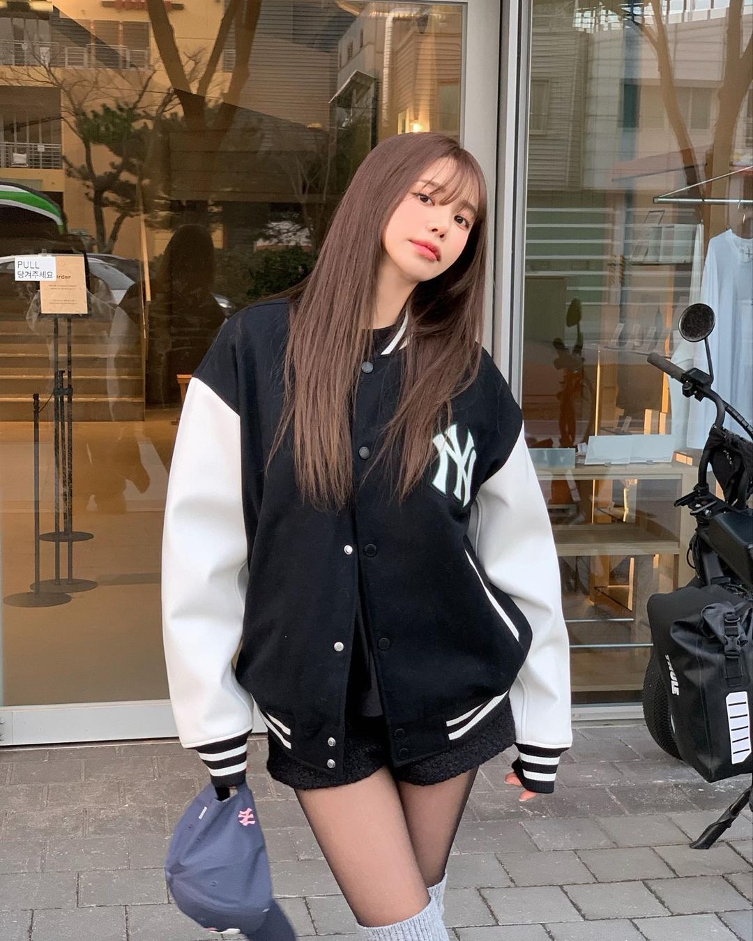 作为经常上身为 MLB 带货的网红之一,Hye Mi 在最近上身黑色 MLB 棒球夹克时搭配了一双 Nike 球鞋。