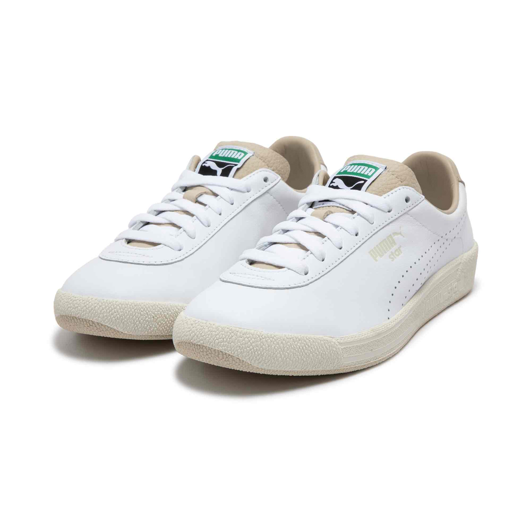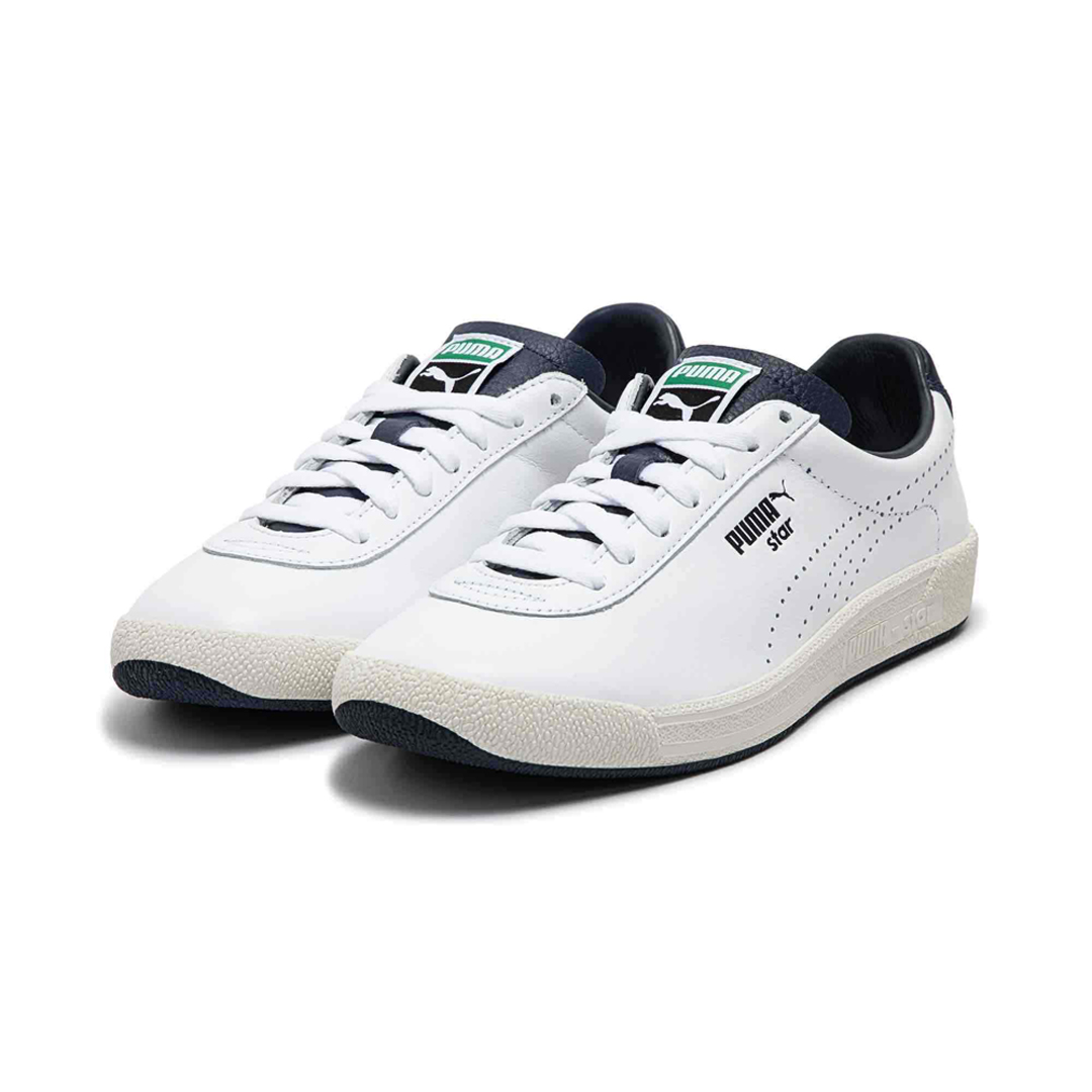 其中鞋款方面采用 PUMA Star 网球鞋为蓝本,经典复古的轮廓搭配上蓝白和米白两款配色,同时满足小姐姐们对复古鞋和小白鞋的需求。