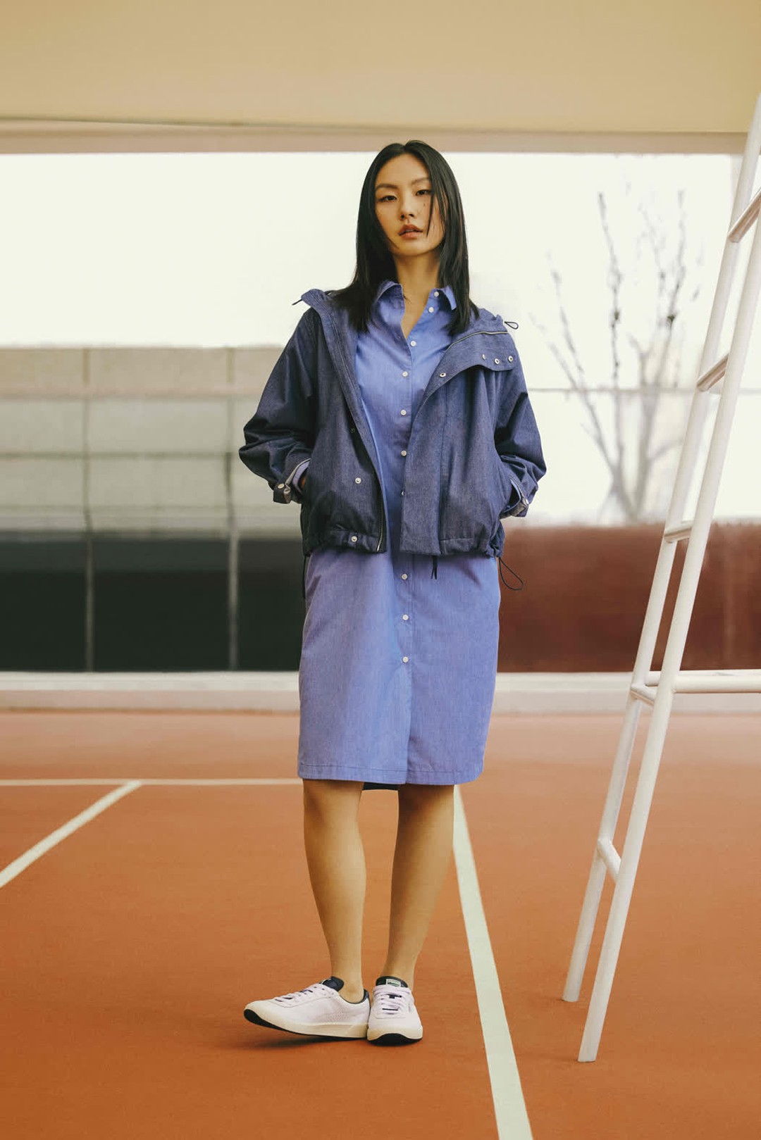 其中,梭织外套共呈现蓝、粉两式配色,并推出对应色系长裙。