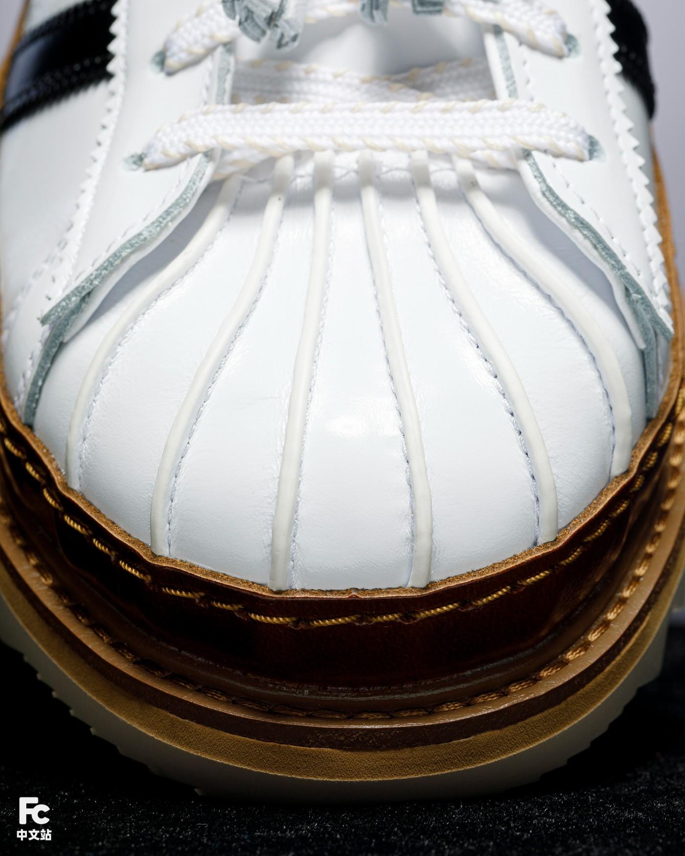 保留了 SUPERSTAR 经典的黑白构色方案,使用有光泽感的皮革包裹鞋面,包括鞋头位置同为皮革材质,视觉呈现熟悉又新颖。