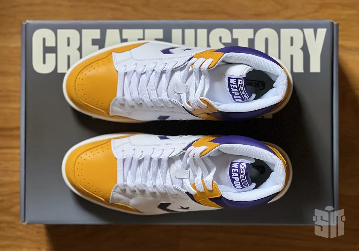 下面附上更多的 Converse Weapon “Lakers” 实物图,大家不妨过过眼瘾吧。