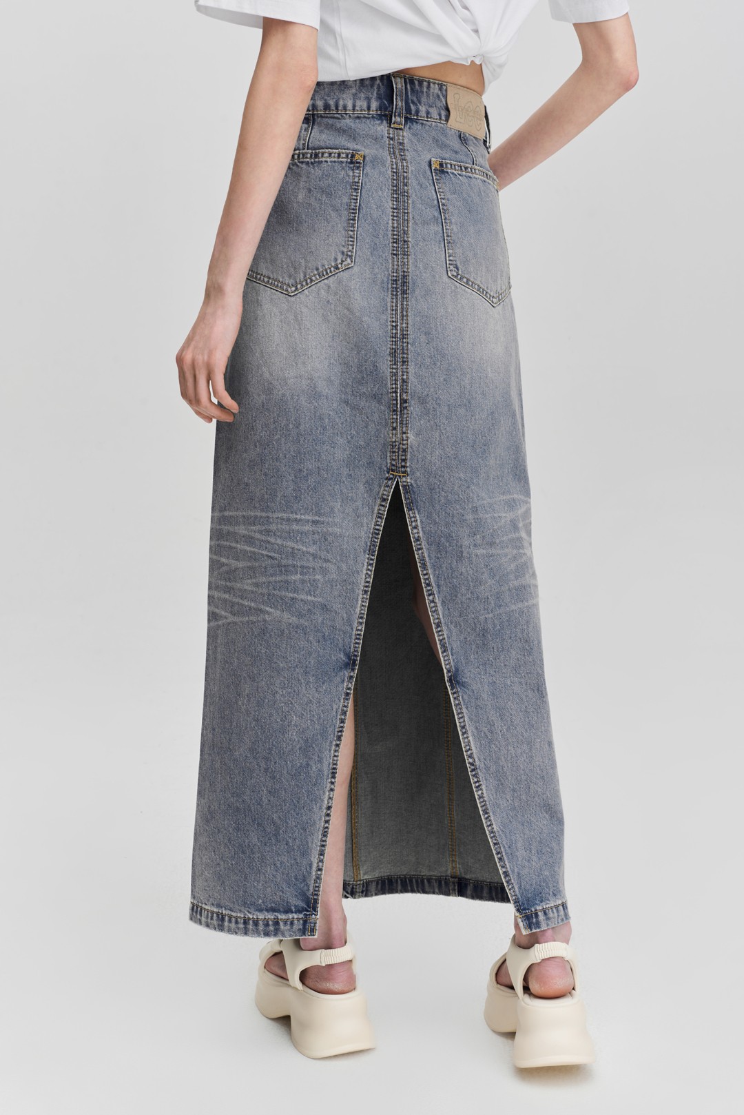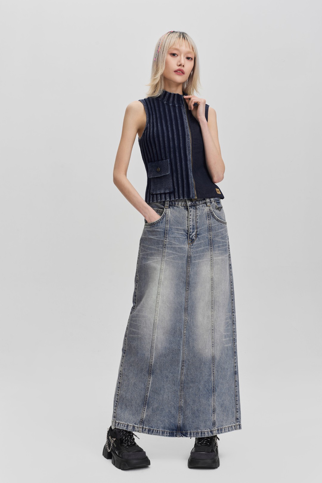A 字牛仔长裙搭配传统复古洗水,上身则是新颖的毛衣和牛仔面料相拼接的毛衣背心。