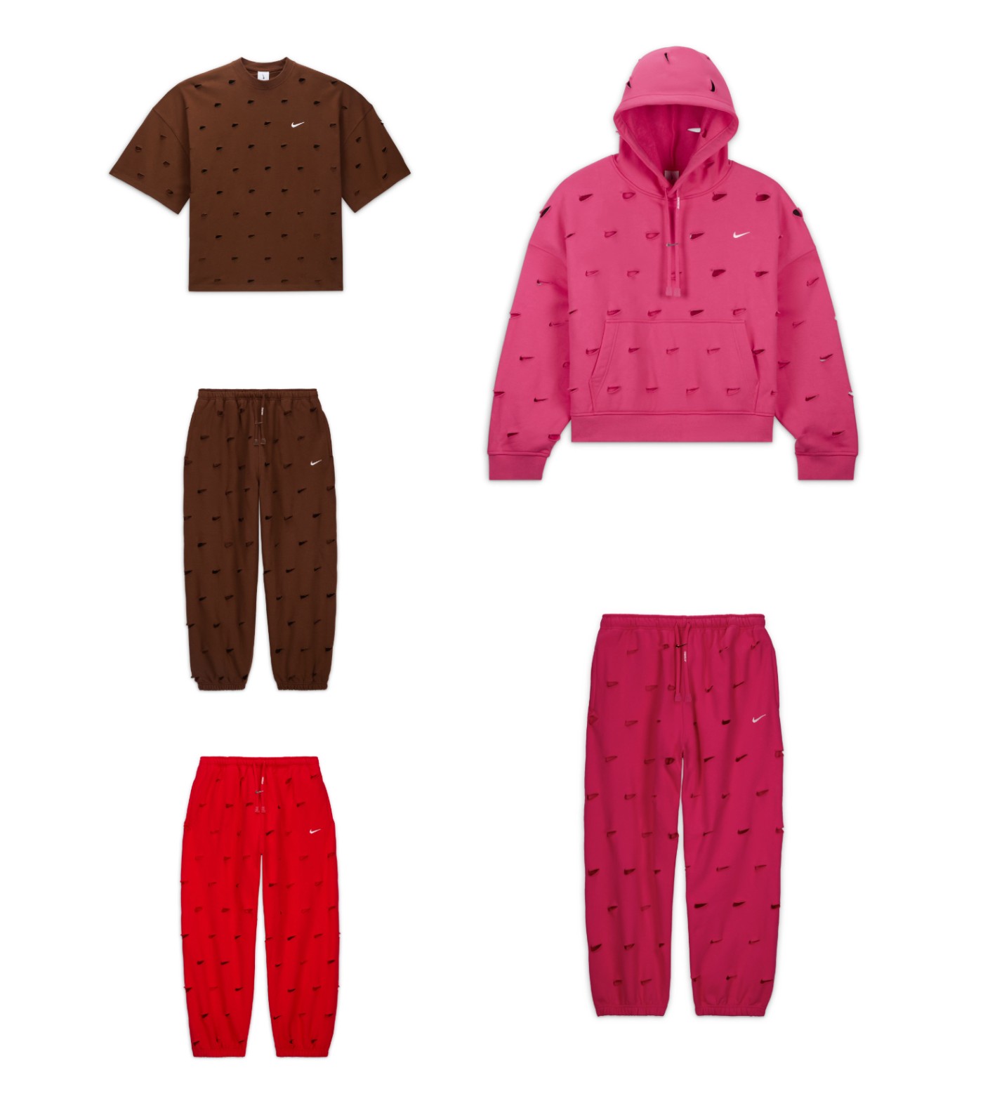 而在中性服装中,包含了 T 恤、卫衣和运动裤,均带有镭射 Swoosh 图案。