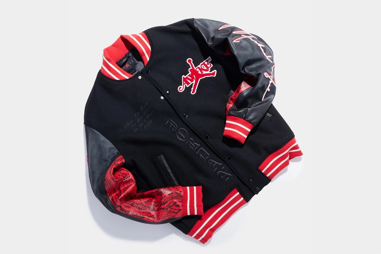 其中棒球夹克使用两种不同质感的面料拼接,袖子部分则是大面积蛇纹装饰,呼应鞋款设计语言。