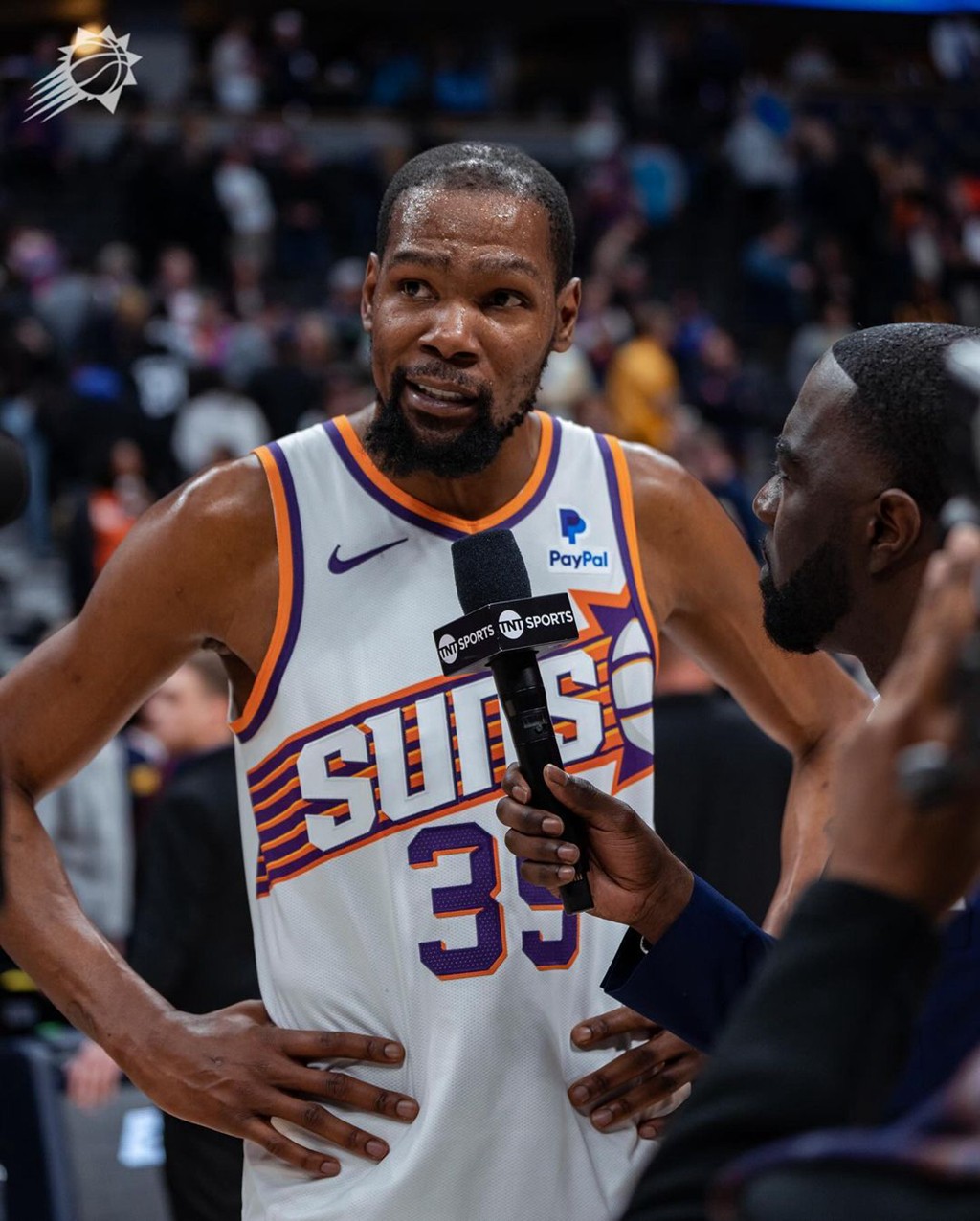 紧接着则是太阳对阵掘金的焦点战,已经 35 岁的杜兰特在球队即将遭遇大逆转时挺身而出,连续三分杀死加时赛,带领球队艰难战胜卫冕冠军。