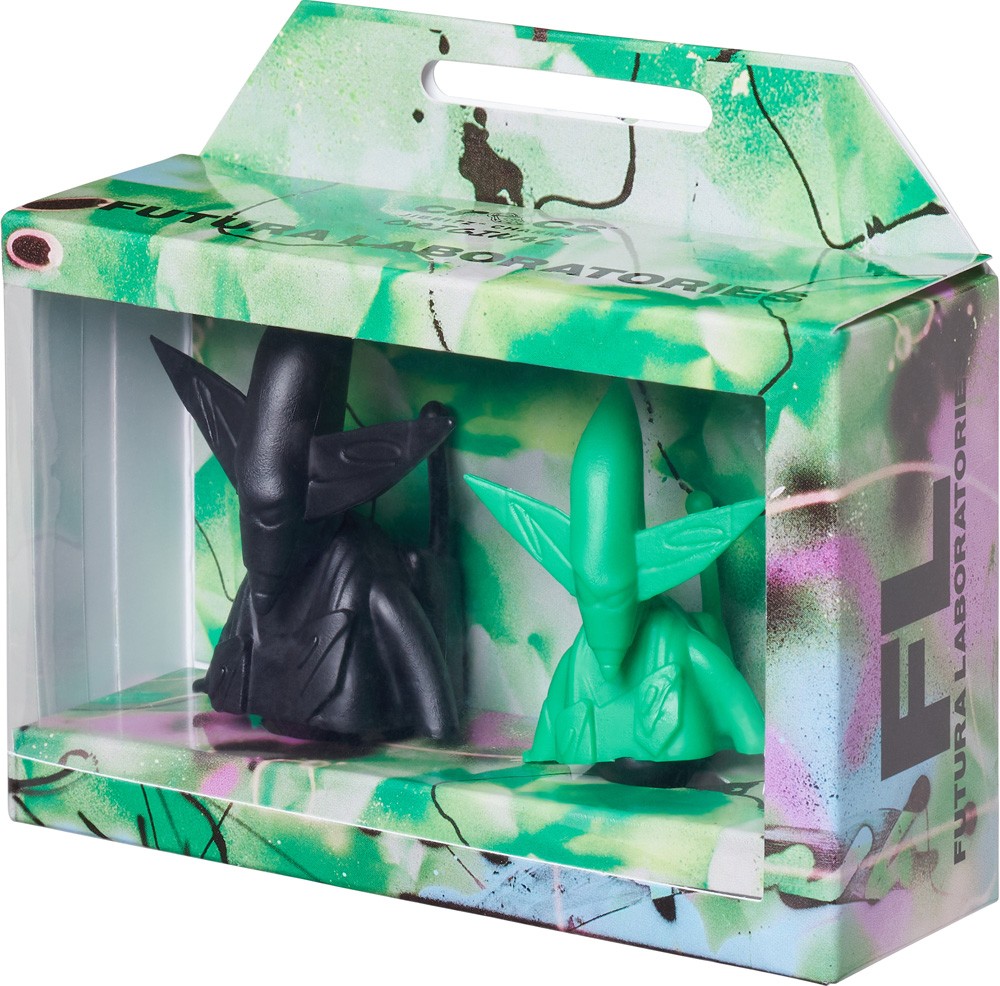 两款配色均附赠专属智必星,鞋面则重现 Futura 拿手的喷漆涂鸦风格,诠释标志性的原子图案设定。
