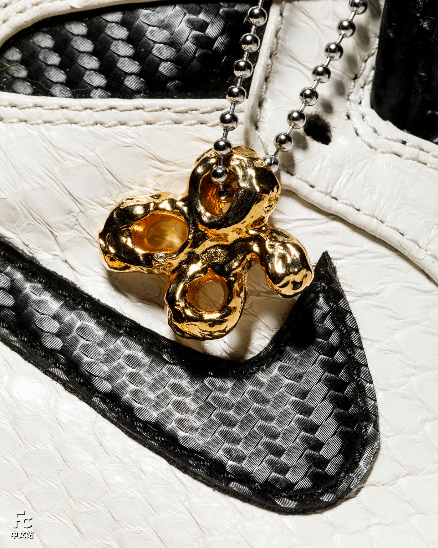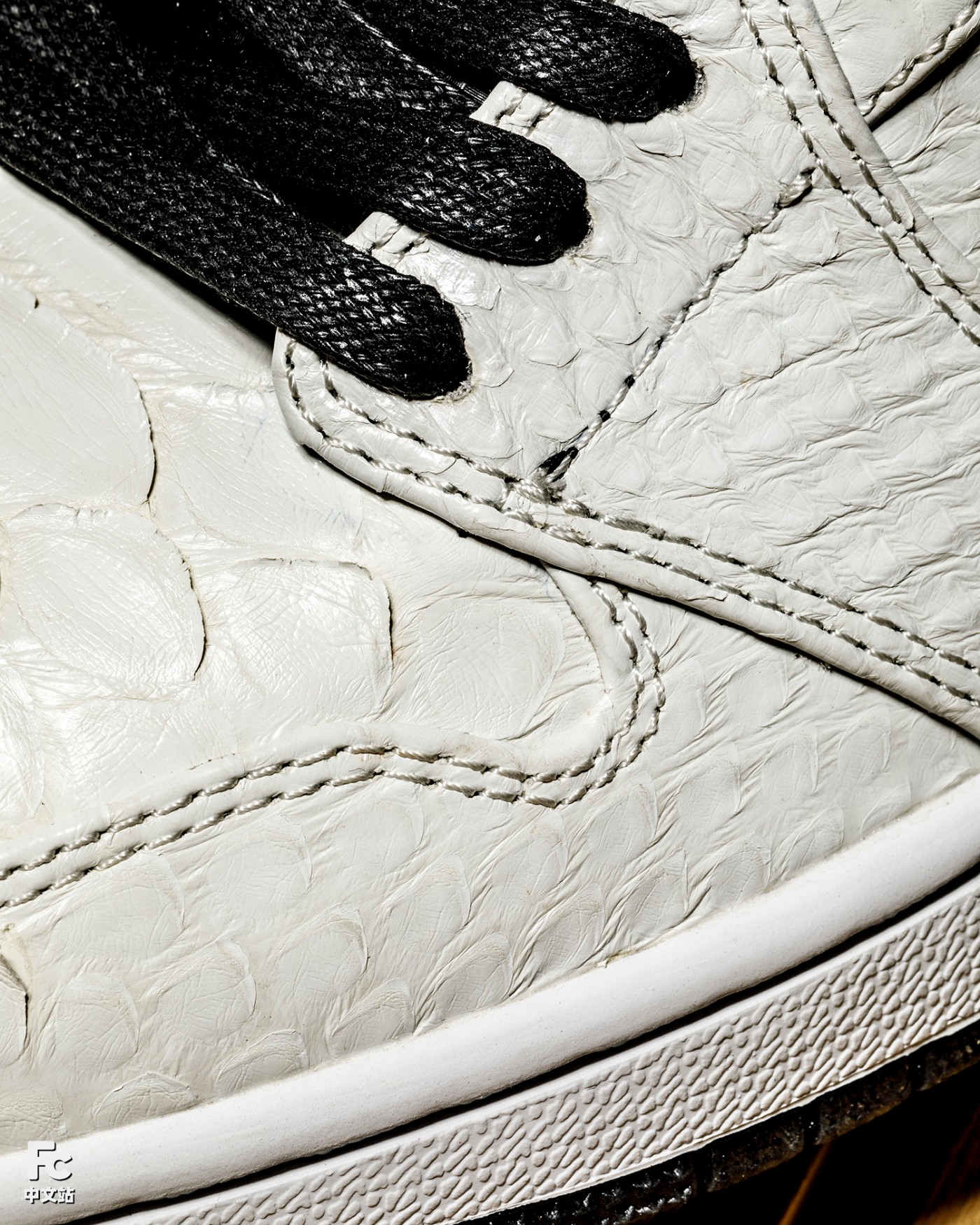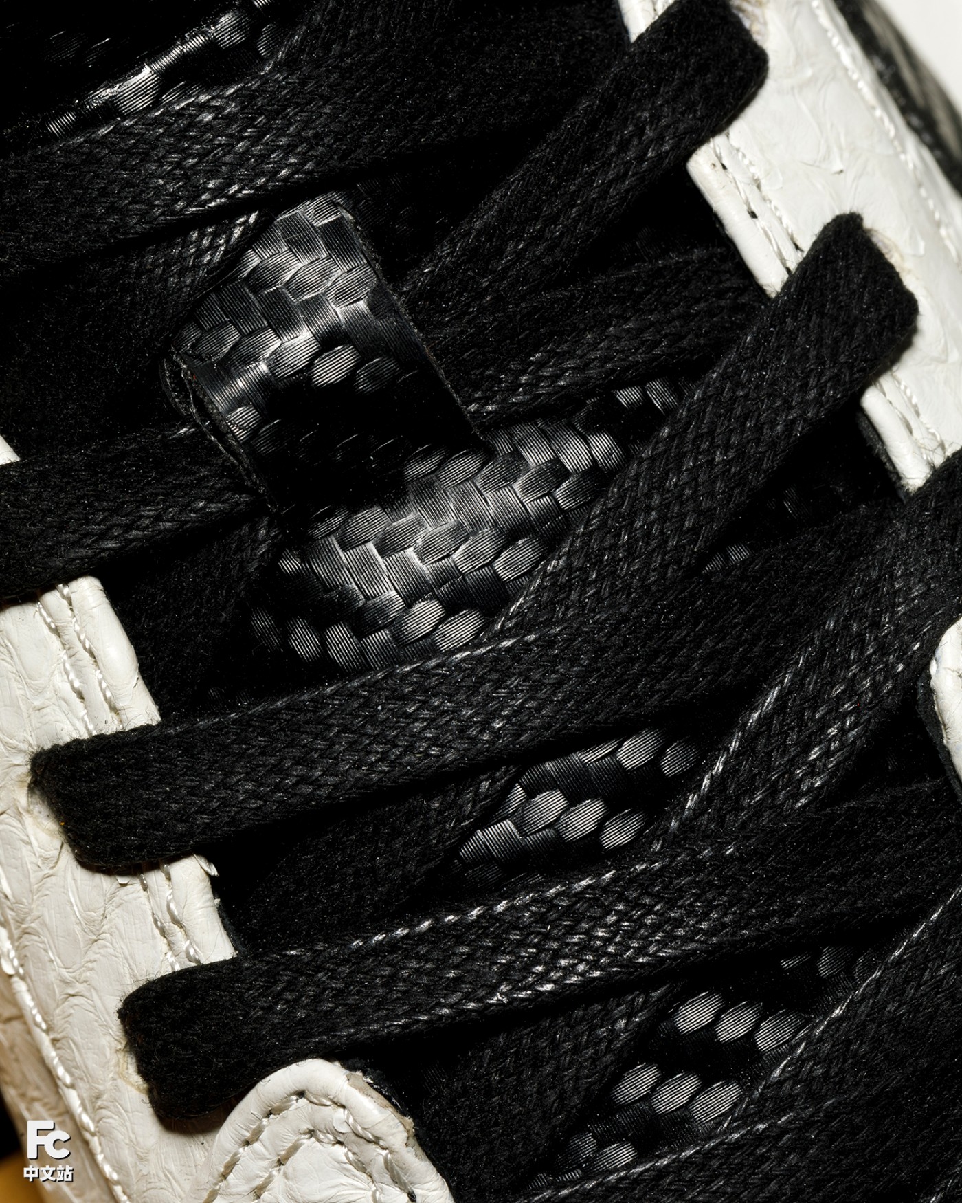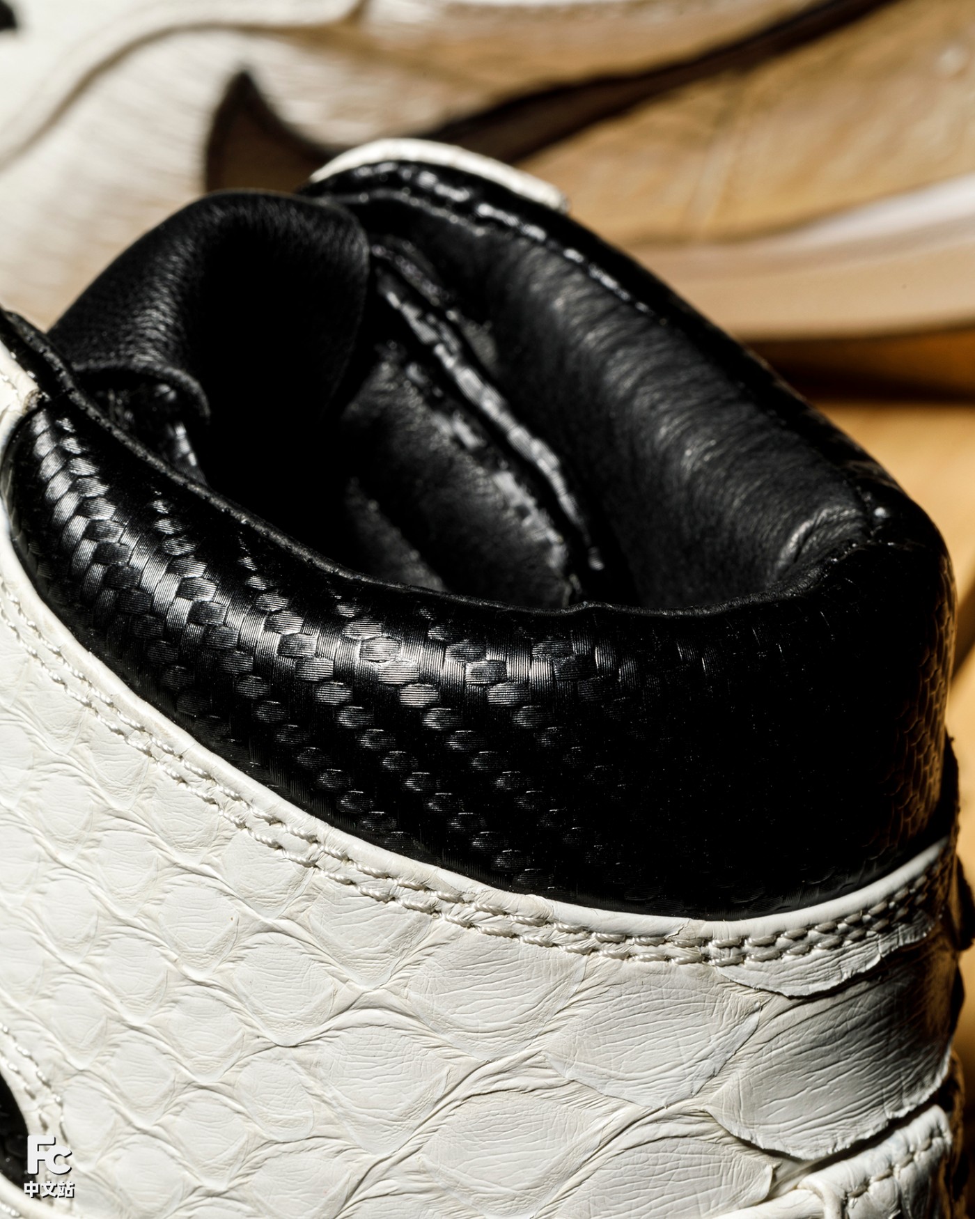 鞋身还原 AE86 经典黑白撞色为基底,华丽的白色蟒蛇与鞋舌、后跟的碳纤维纹理,呼应拓海更换新引擎后「赛用 86」的蜕变。