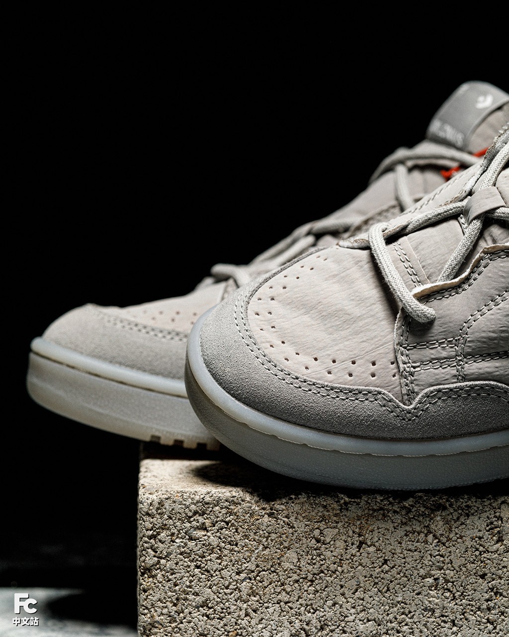 尼龙鞋面、翻毛皮和少量光面皮革的混搭,使得统一的灰色在自然光线下呈现深浅不一的视觉层次。
