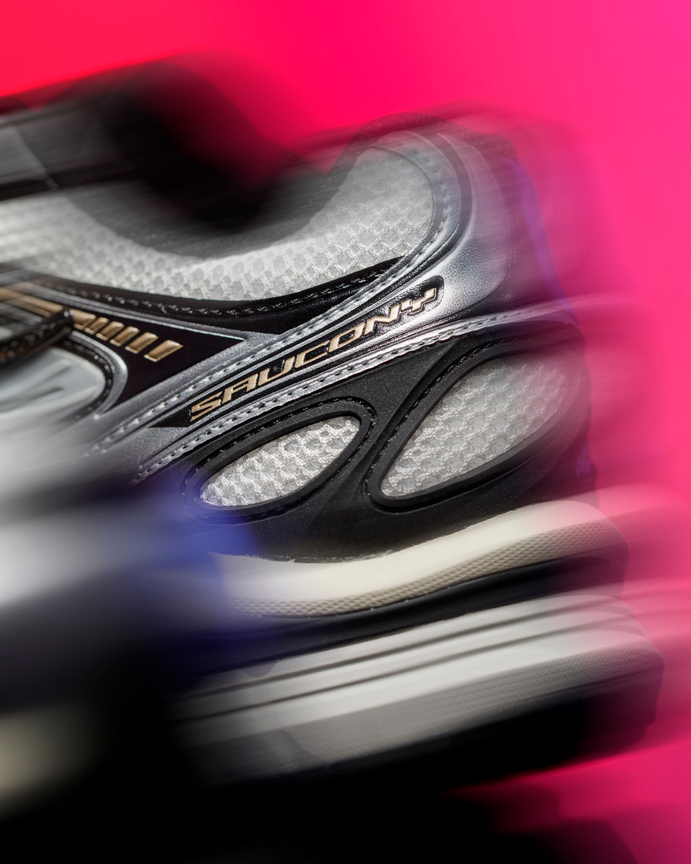 透气织物与真皮材质共同构建的银灰装扮,通过金属光泽营造的未来质感,完美衬托出金色索康尼 Logo 独有的优雅弧线。