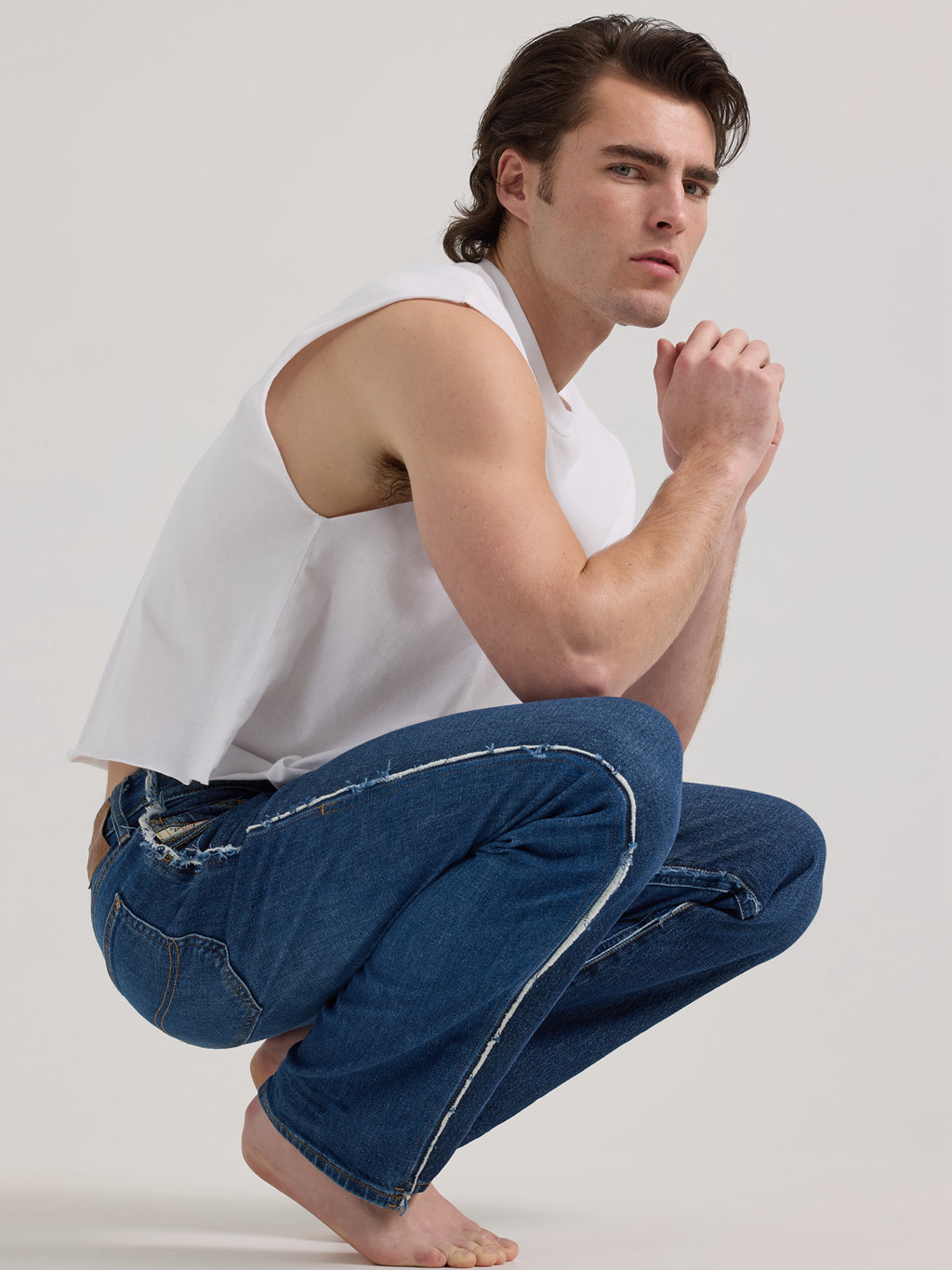 每条牛仔裤一半 DIESEL,一半 Lee,营造出独特的上身观感。