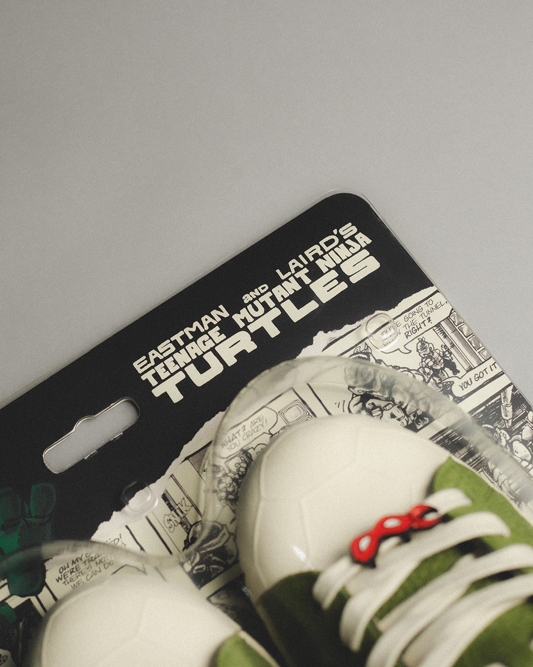 更绝的是鞋盒直接换成了玩偶常用的透明气泡包装,每双鞋还附带一本《忍者神龟》漫画,致敬意味不言而喻。