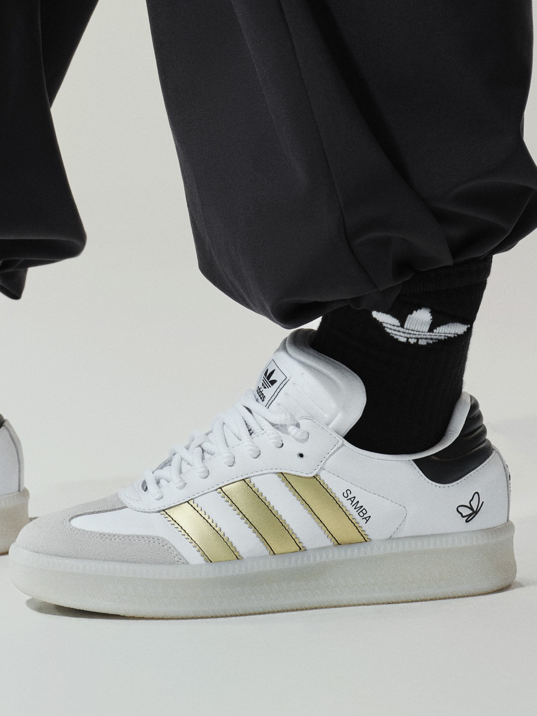 鞋款方面,Samba XLG 采用白色皮革鞋身搭配黑色三条纹的经典设计呈现,拥有比原版 Samba 更宽大的鞋身比例轮廓以及加厚中底。