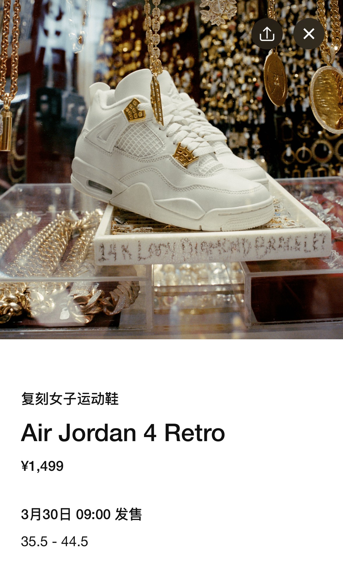 此前已经登场的「金扣」Air Jordan 4 迎来补货,同样是明天上午 9 点。