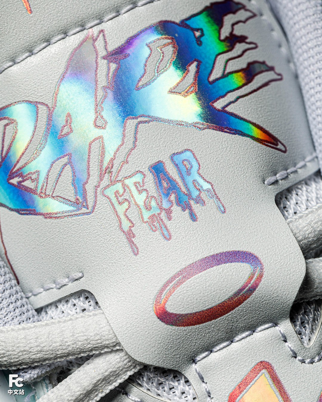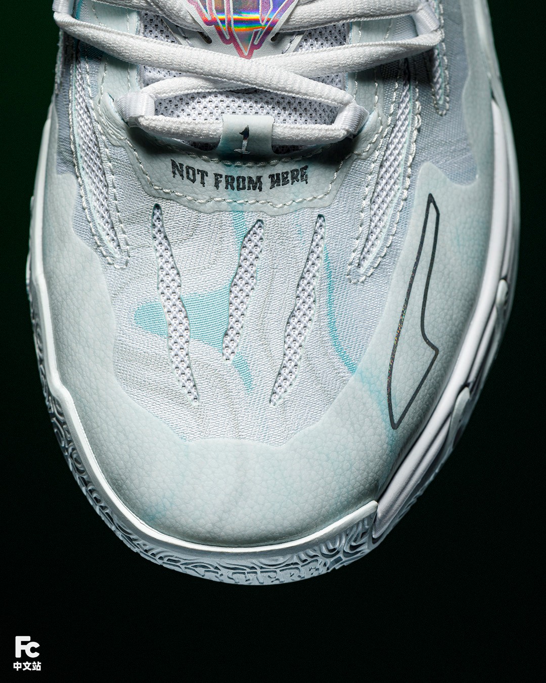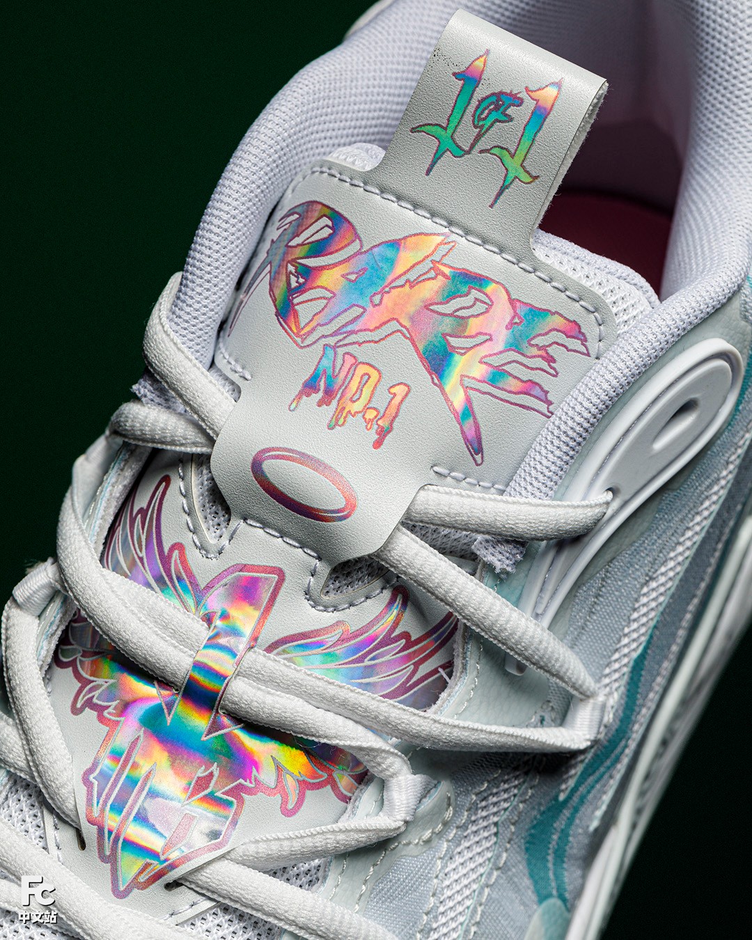 使用炫彩面料覆盖鞋舌所有的 Logo 和拉梅洛 Slogan,在不同角度下仿佛彩虹般,不停变幻。