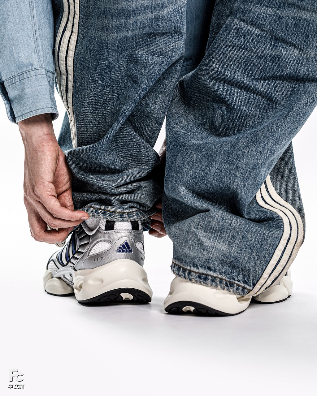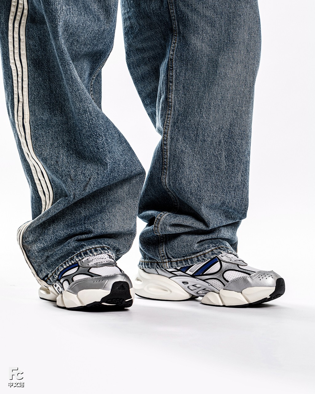 穿搭方面,小编分别选择了阔腿牛仔裤和黑色卫裤,来衬托这双略带奢侈品球鞋味道的 VENTO 3.0。