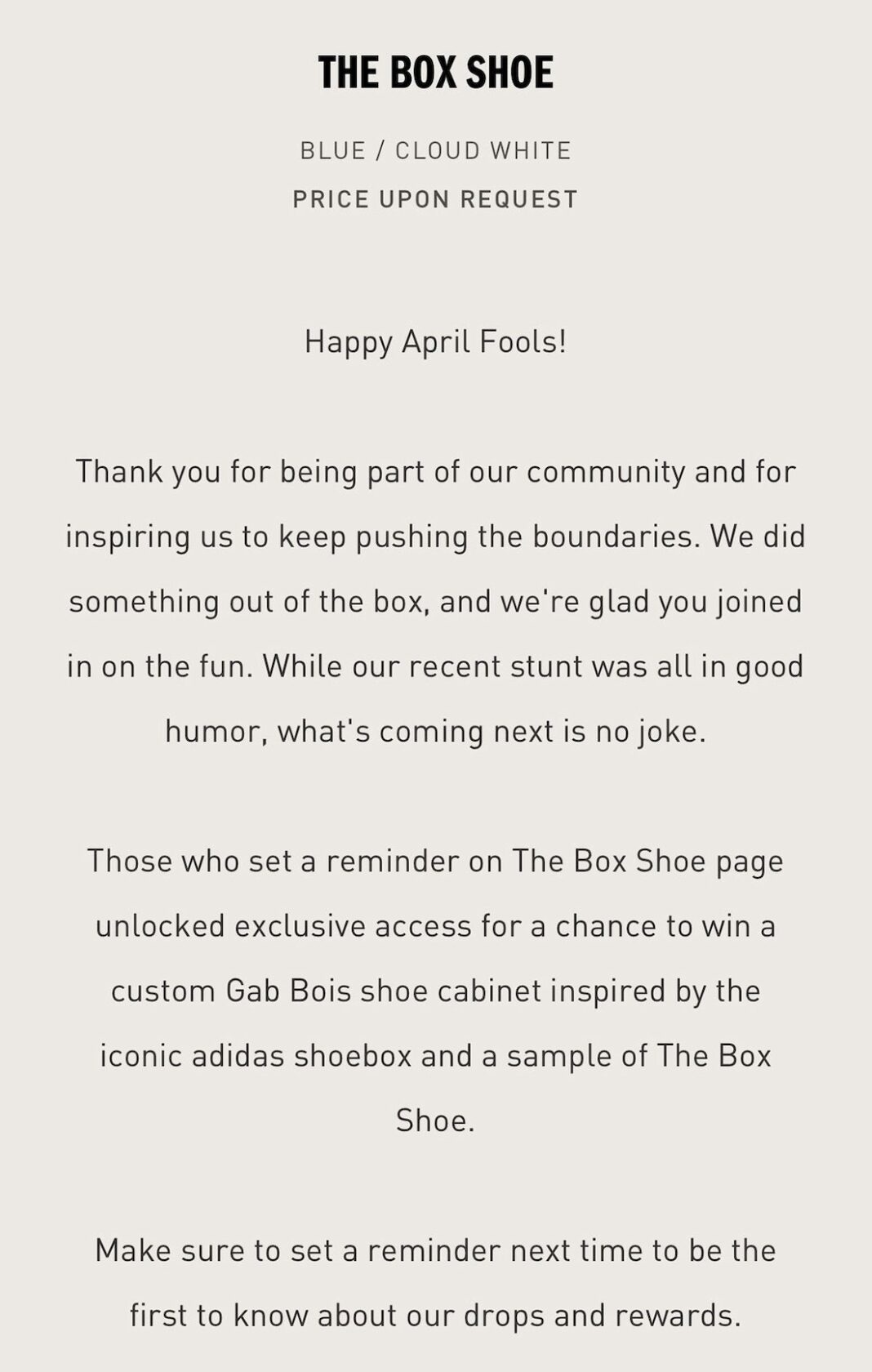 然而就在昨天,三叶草官方已经正式确认,Box Shoe 确实是愚人节恶作剧。