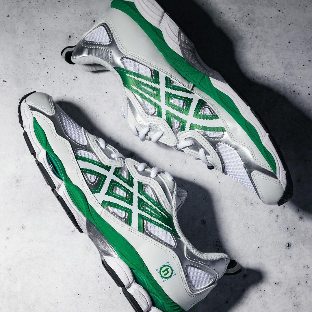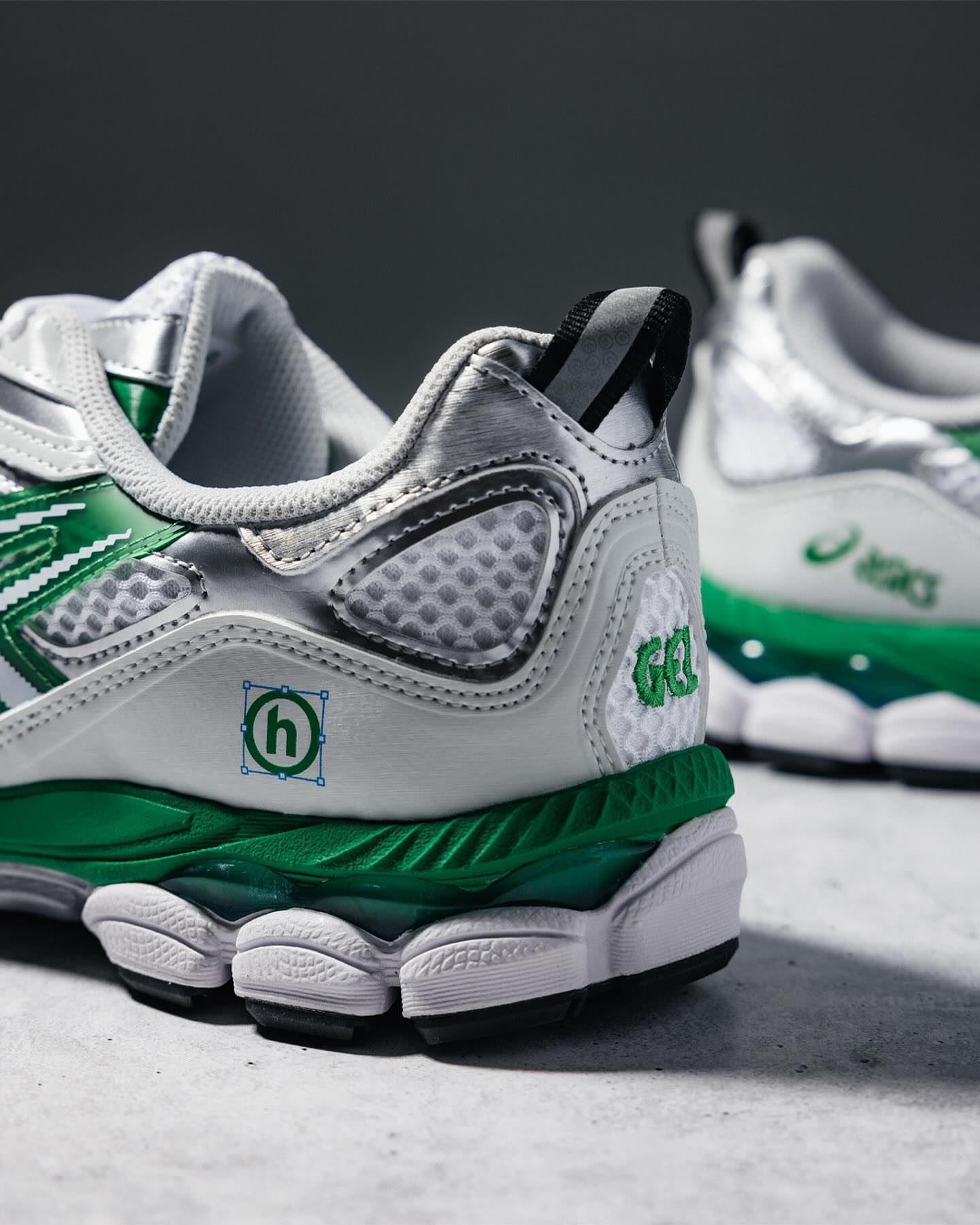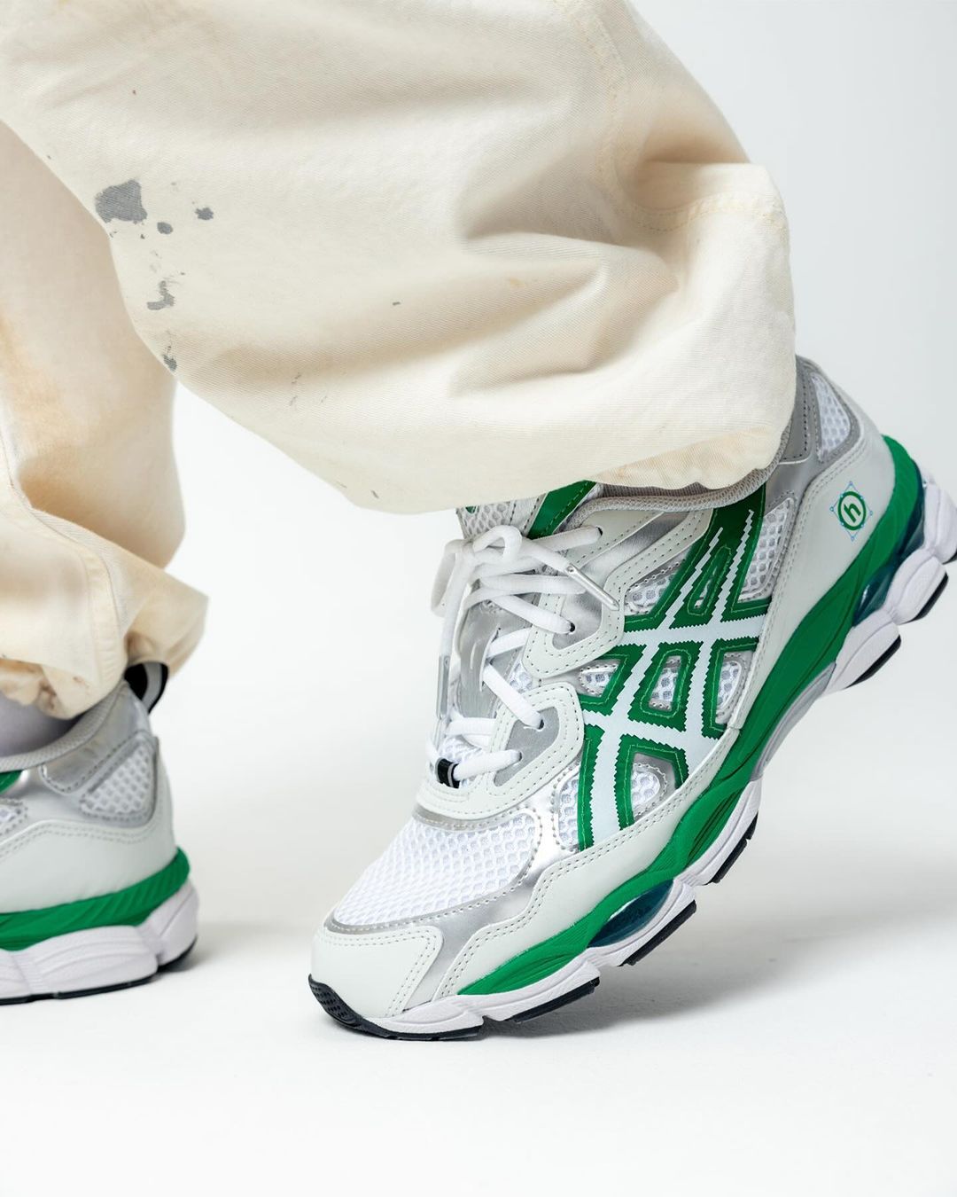 不同于上一次三方联名 GT-2160 的湖水绿浸染效果,这双 GEL-NYC 回归了白绿的 HIDDEN.NY 标志性色调方案。