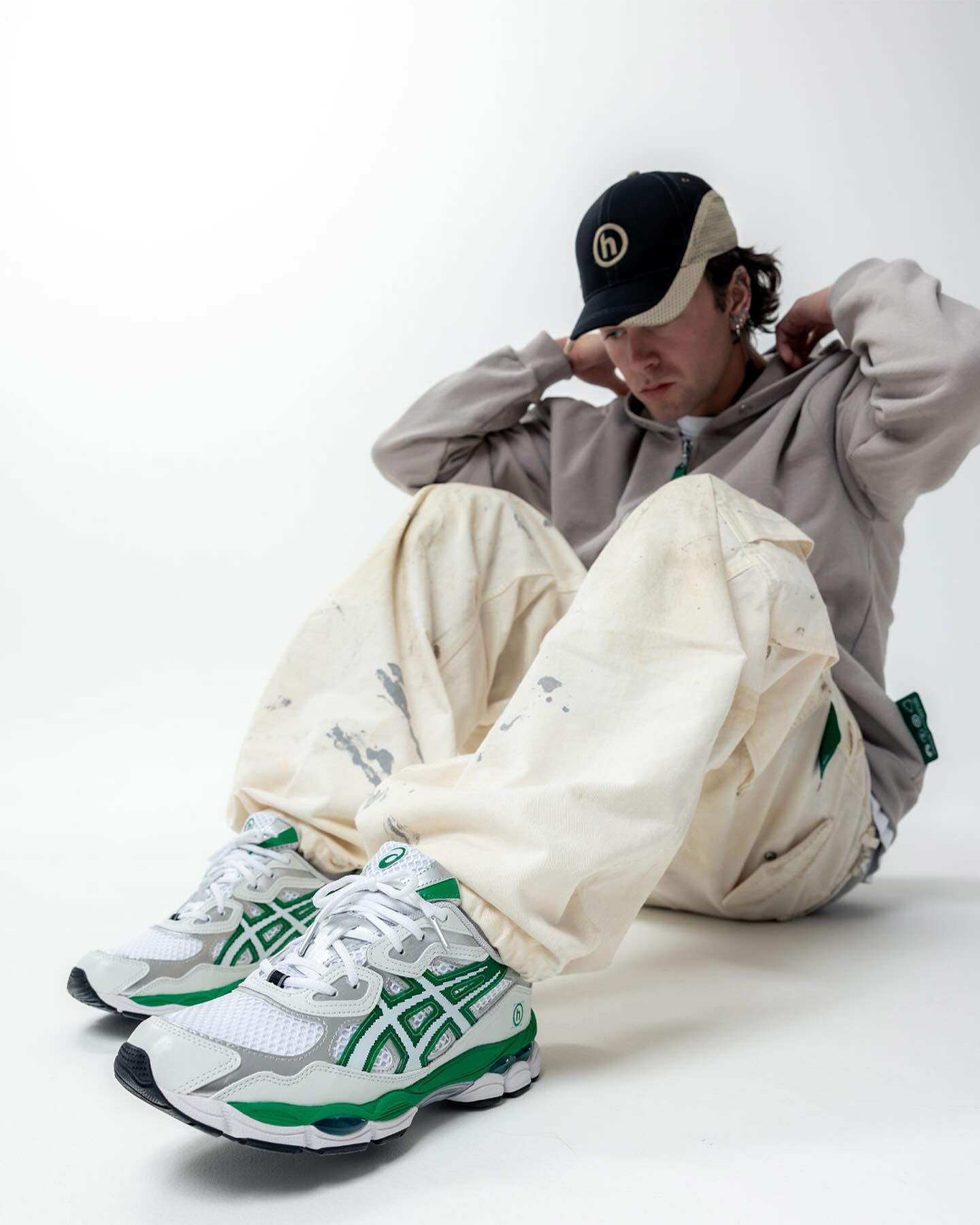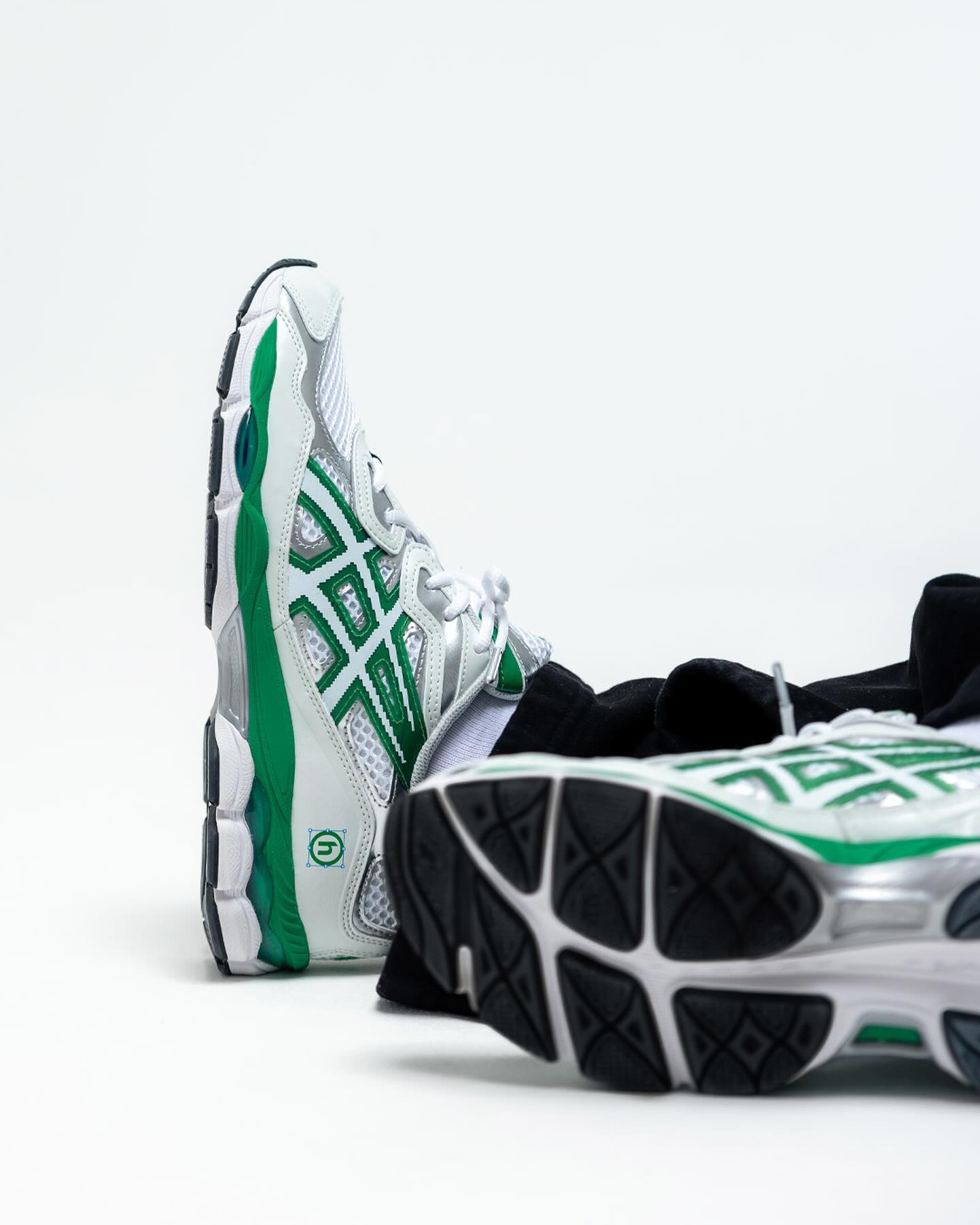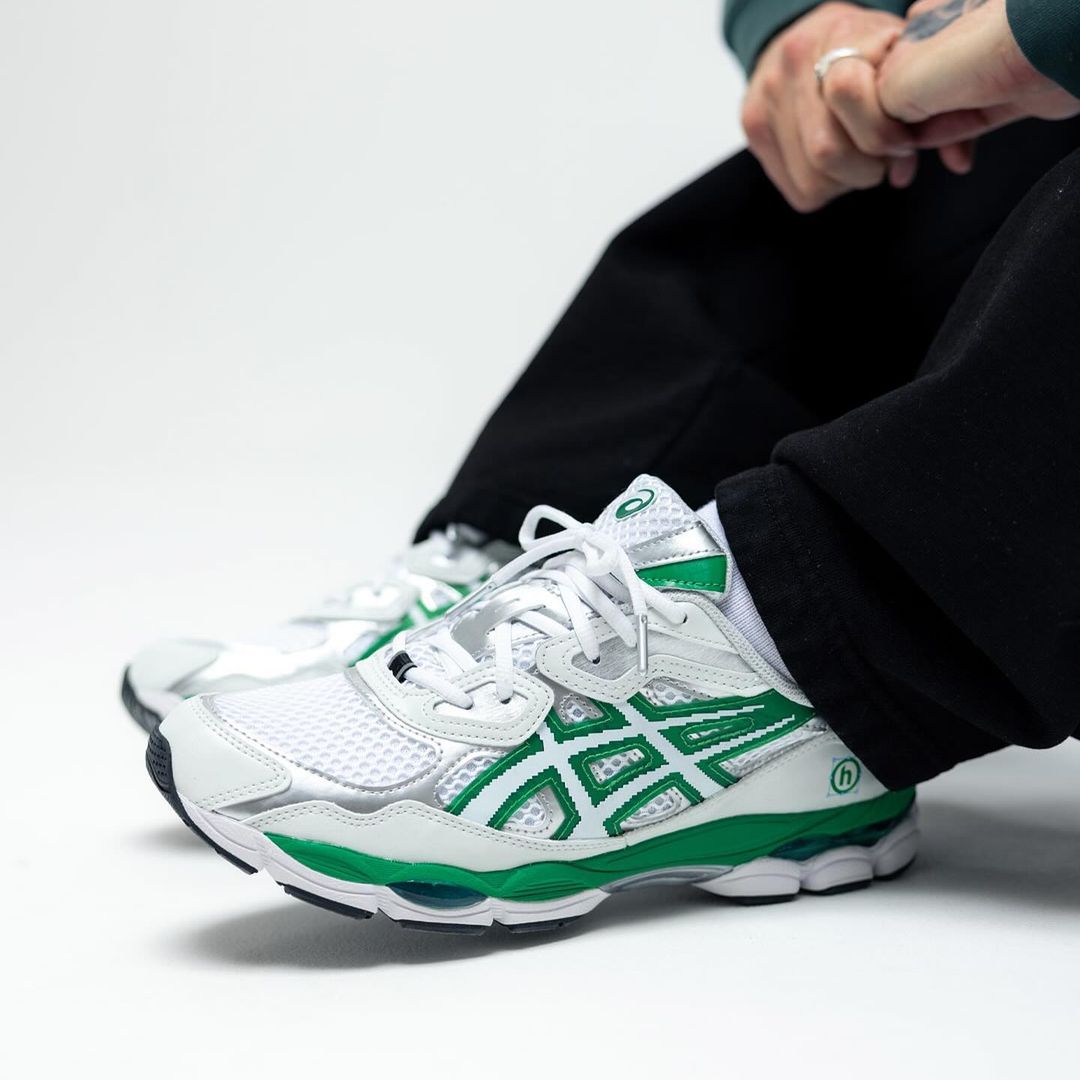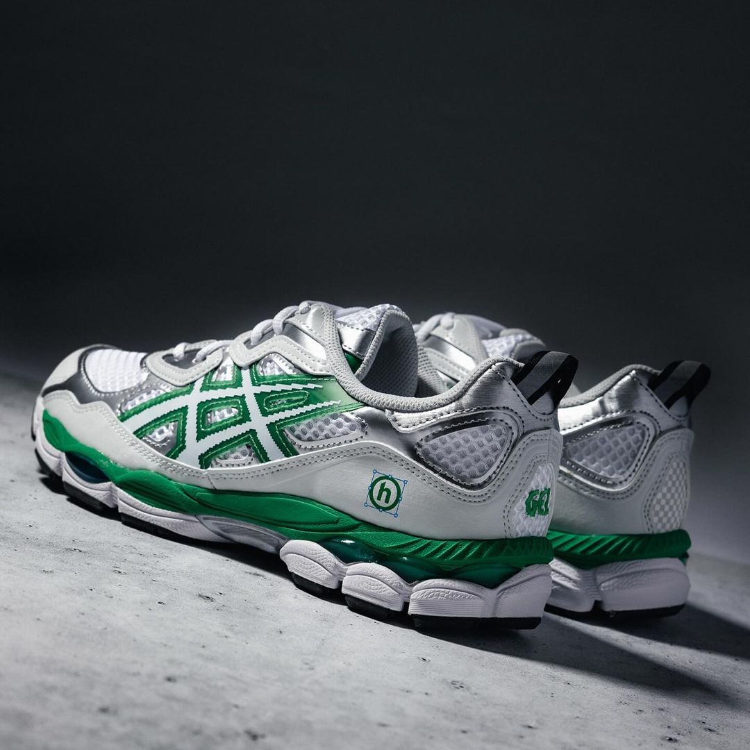 不同于上一次三方联名 GT-2160 的湖水绿浸染效果,这双 GEL-NYC 回归了白绿的 HIDDEN.NY 标志性色调方案。
