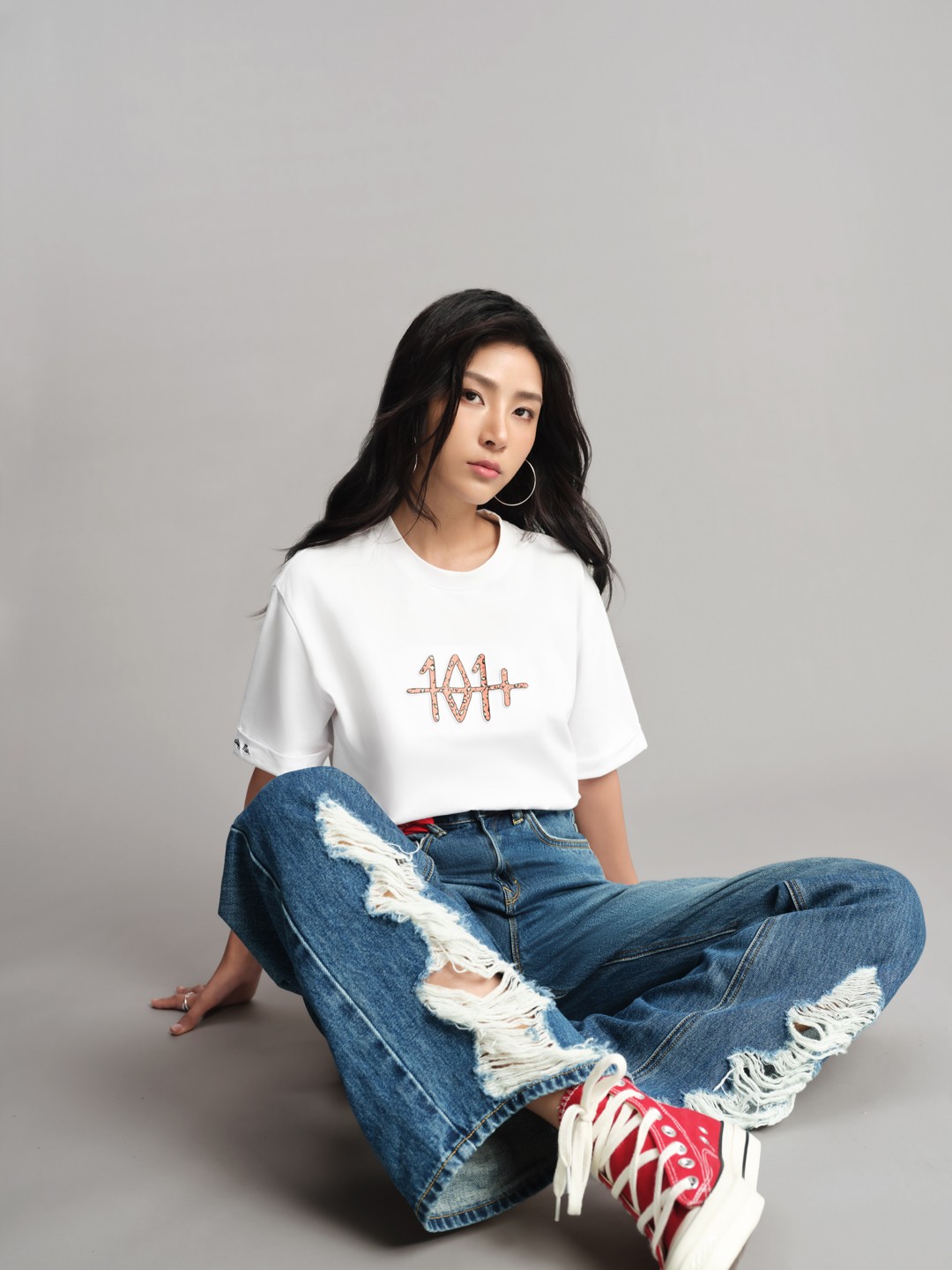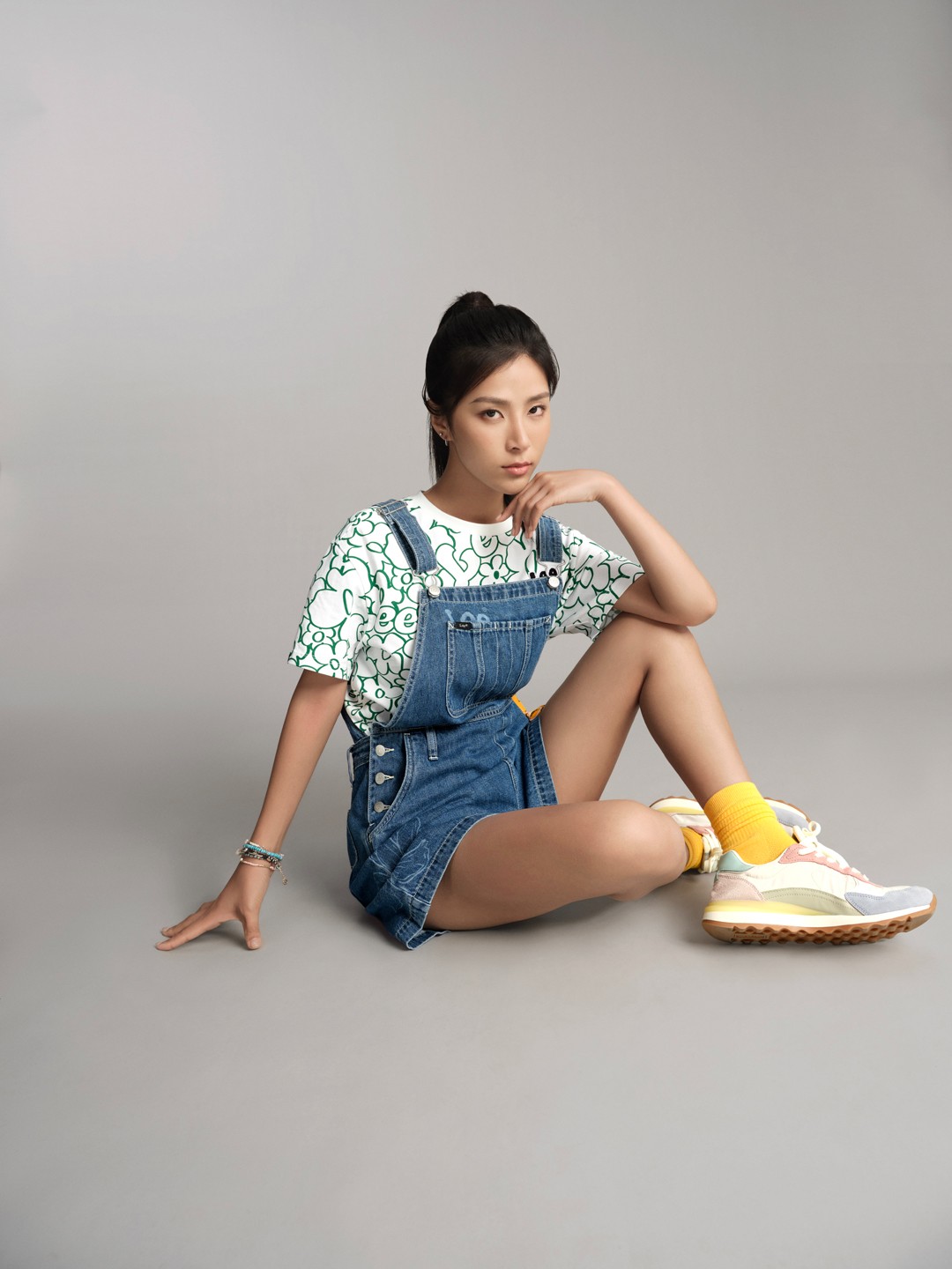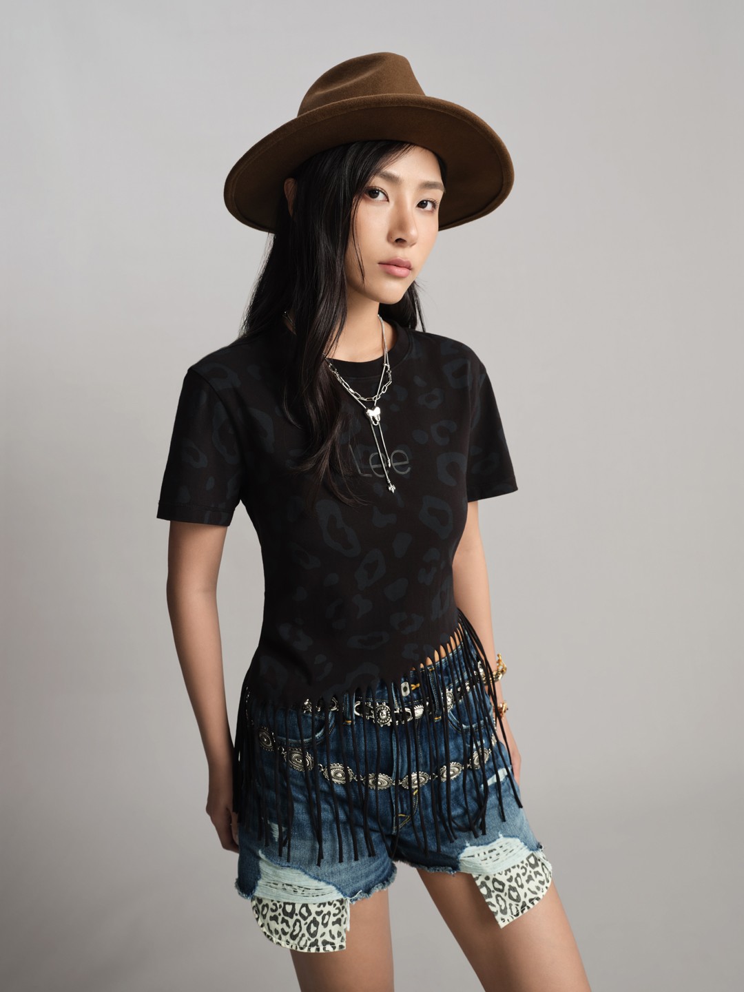 印花 Tee 表面平铺花朵图案,与 Lee 品牌标识结合呈现,采用流行的短身版型,搭配镭射花朵图案的丹宁背带短裤,释放活力与灵动。