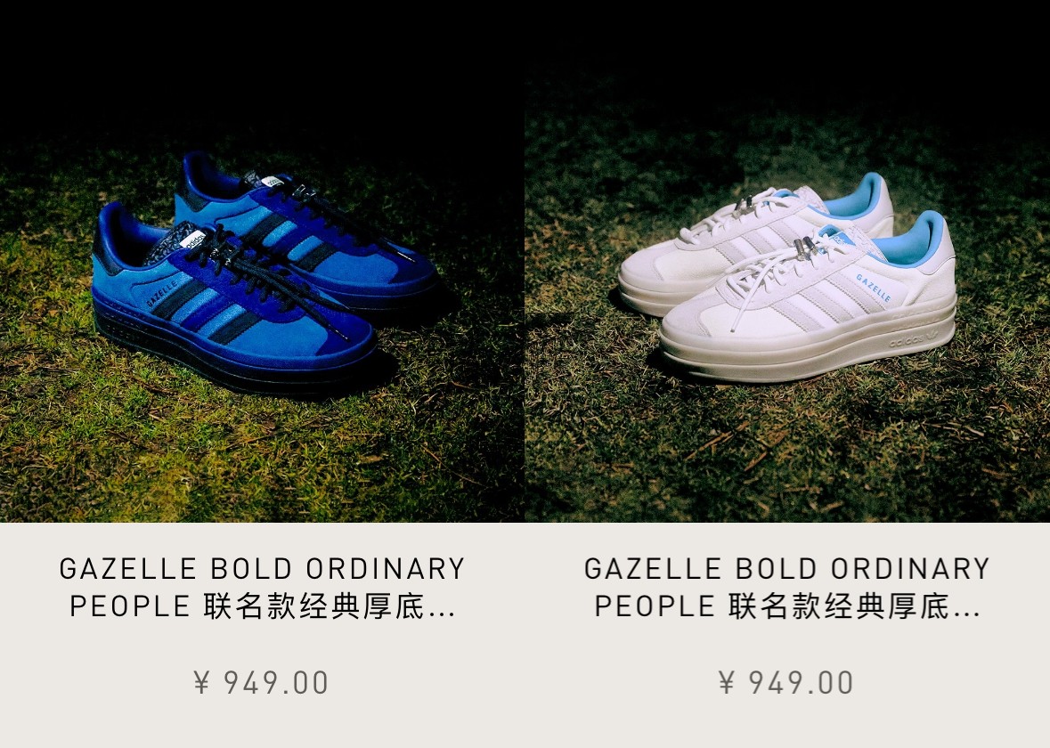 两款配色的 Ordinary People x adidas Originals Gazelle BOLD 现已登陆国区 CONFIRMED APP,定价 ¥949 元。