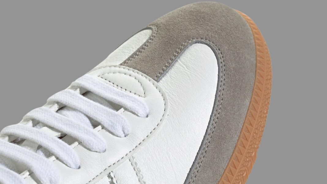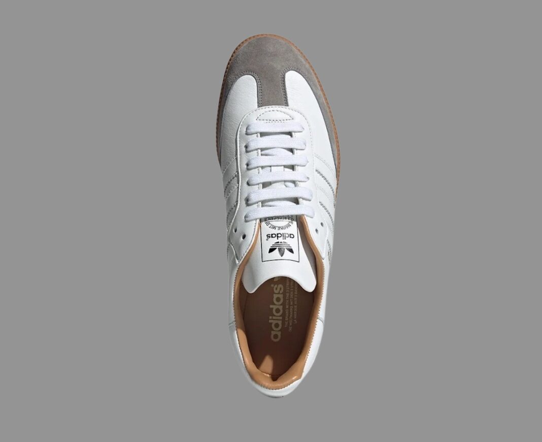 白色主调鞋身,T 字麂皮鞋头,搭配烫金 Samba 字样,视觉感受依然干净素雅。