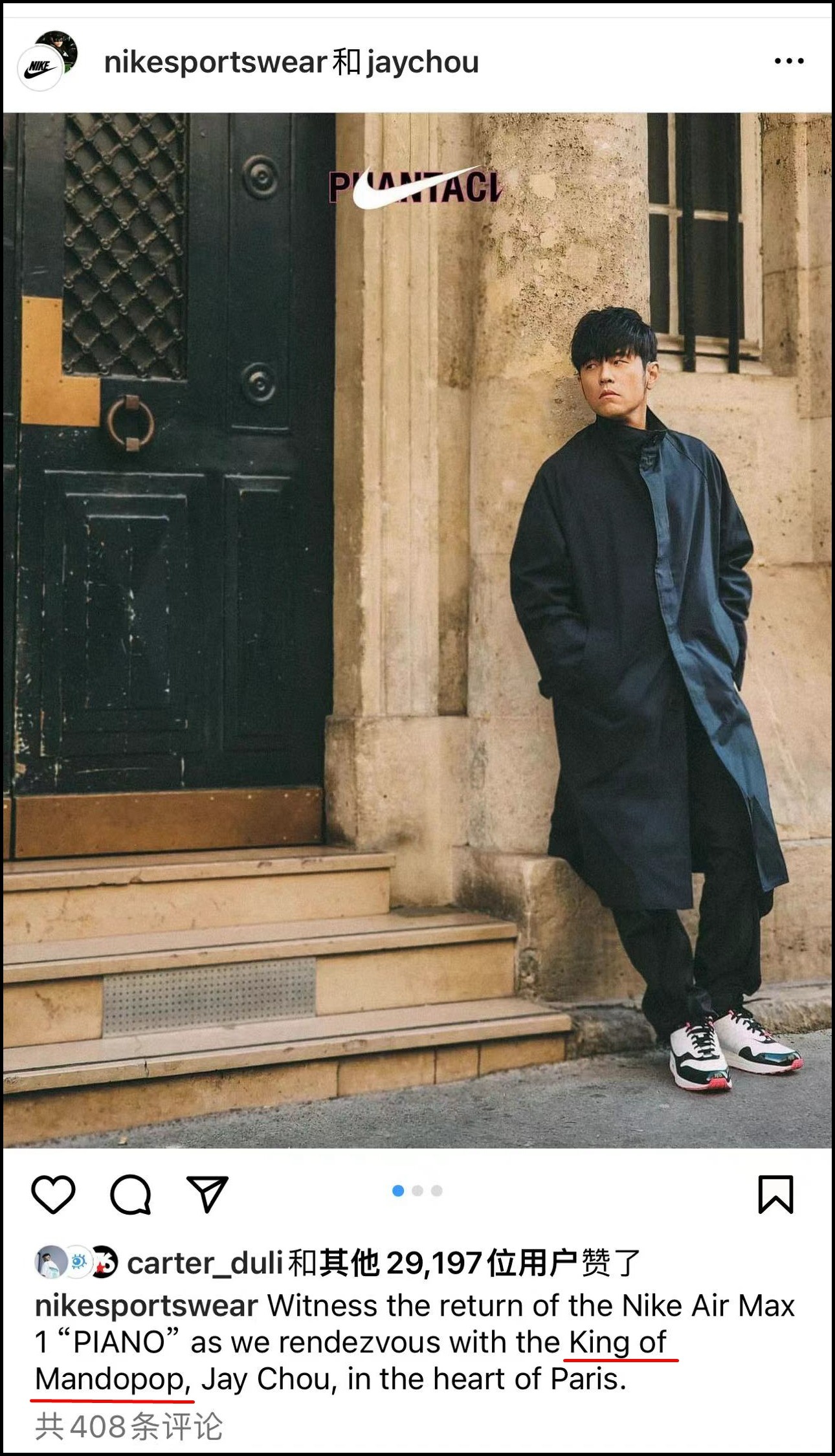 昨天周董在社交平台晒出一组上脚帅照,紧接着 nikesportswear 迅速在评论区展开互动,盛赞周董是华语音乐之王(King of Mandopop)!