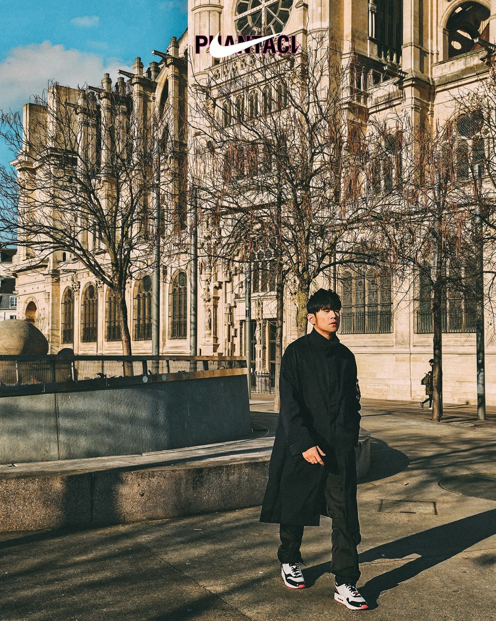 古典的背景,以及周董一身黑色穿搭,把这双球鞋衬托的格外显眼。