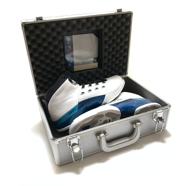 手提箱以金属原色示人,表面铺满精细的凸点纹路,最中间浮现浮雕质感的 Jumpman,质感相当豪华、高级。