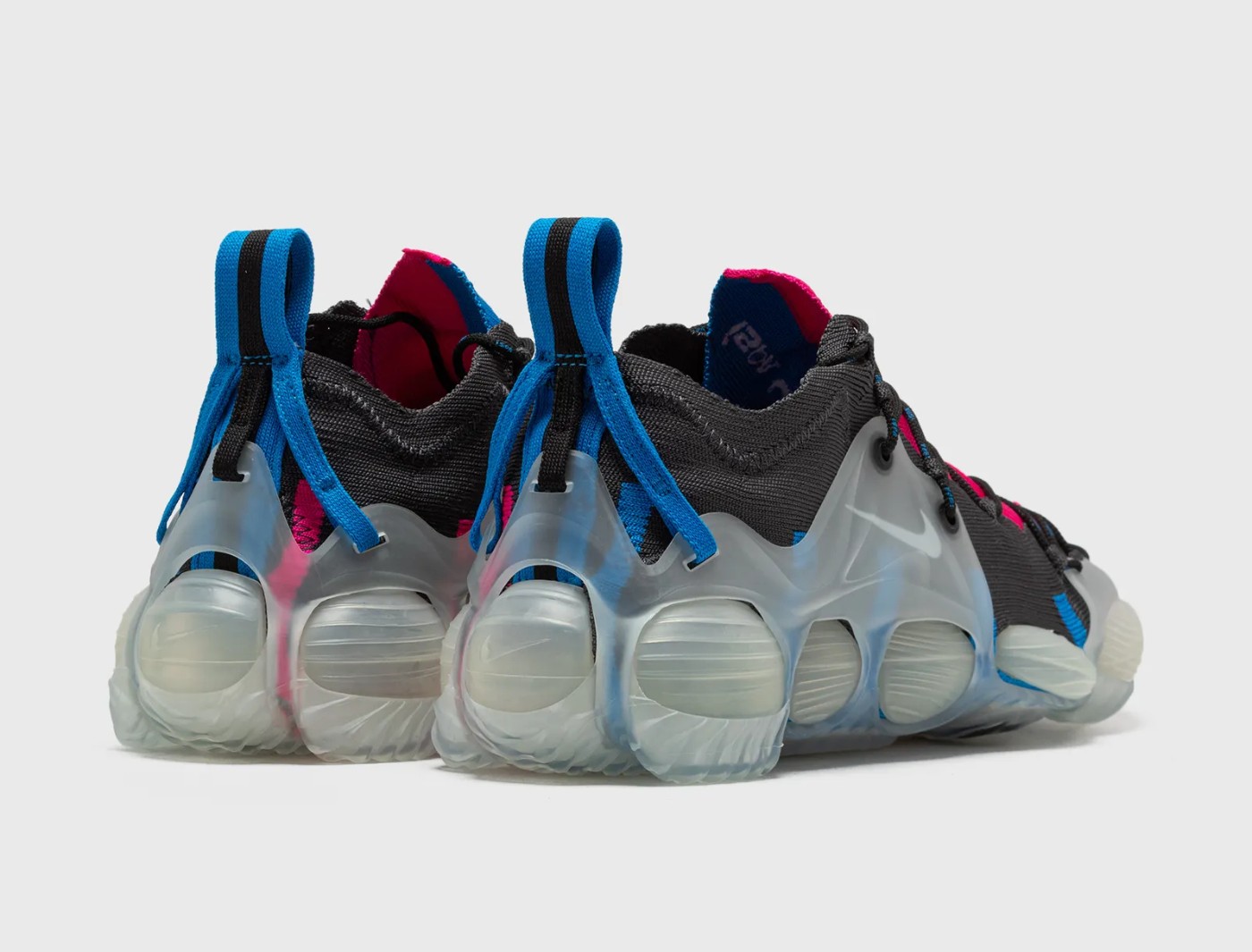 配色方面,黑色基底辅以科幻赛博风格的荧光蓝粉双色,与鞋型本身的未来感相得益彰。