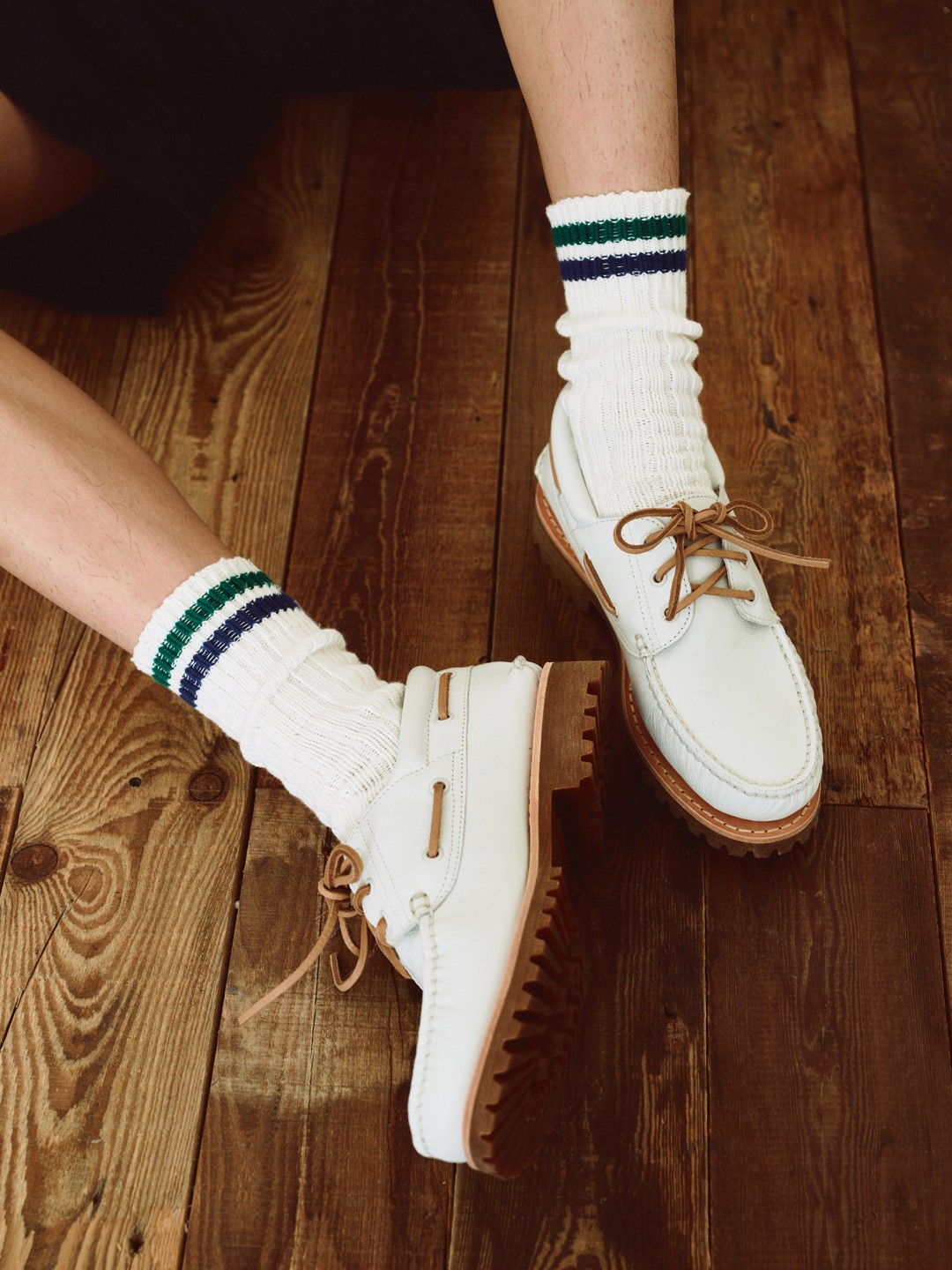 保留了三眼船鞋经典而复古的造型,延续传统手工缝制结构,呈现不俗的精致感和时尚属性。