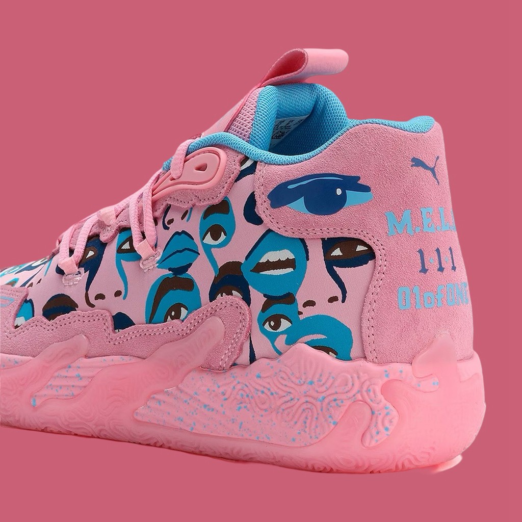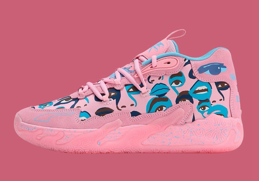果然不出意外,还是熟悉的花哨造型,大量的嫩粉色覆盖鞋面,并印有波普风格的人脸图案,非常具有艺术气质。