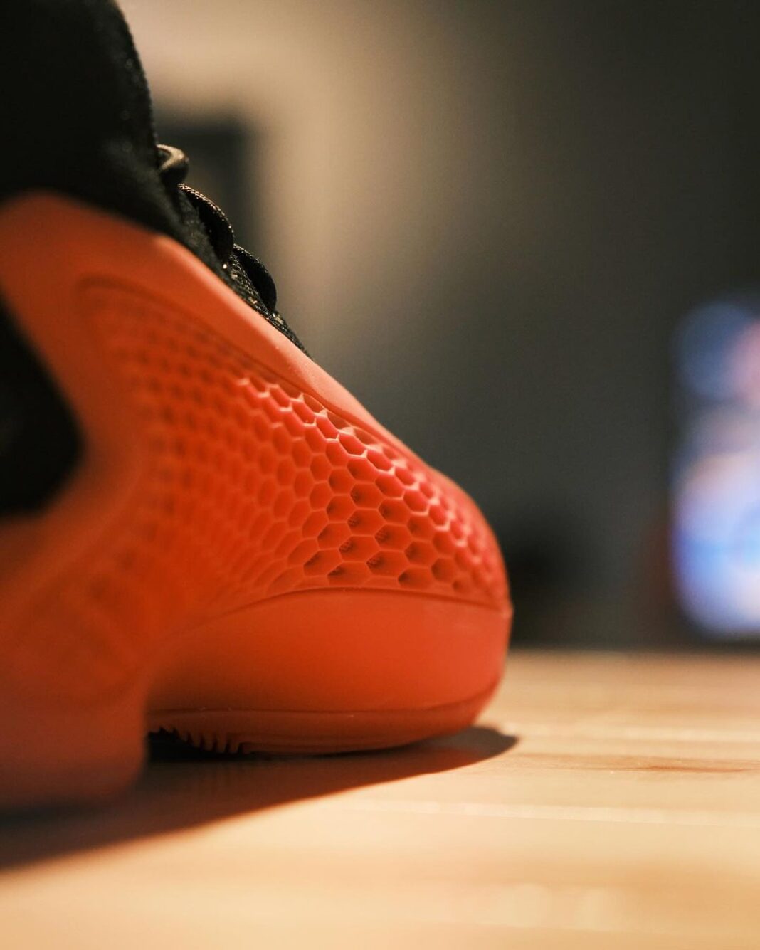 延续了较为传统的中高帮造型,两侧红色的蜂窝状 TPU 包裹黑色内里,作为鞋圈永恒经典的配搭,颜值方面稳稳拿捏。