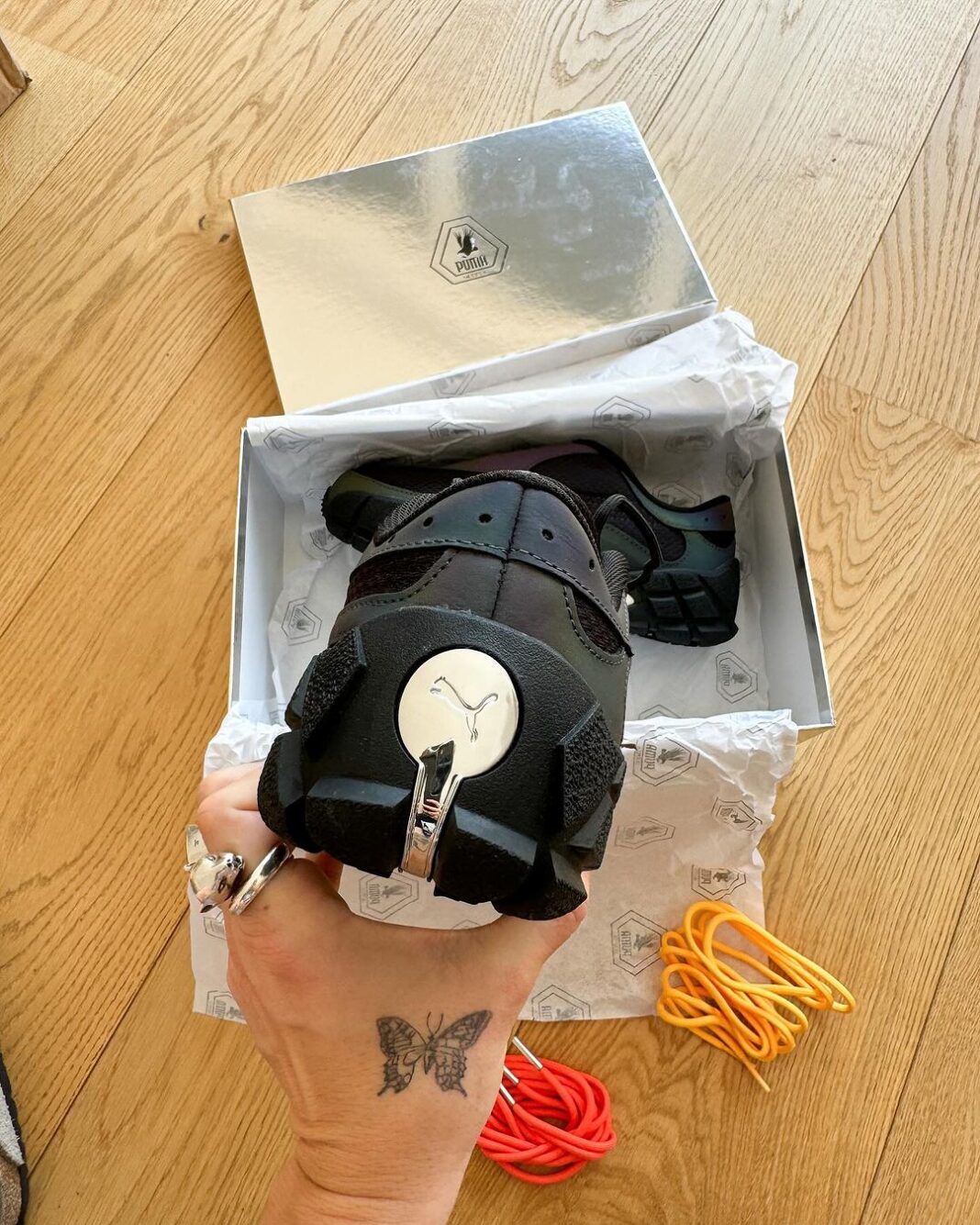 金属光泽的鞋盒中配备了两副格外鲜艳的鞋带,换上后出街回头率还要高出不少。