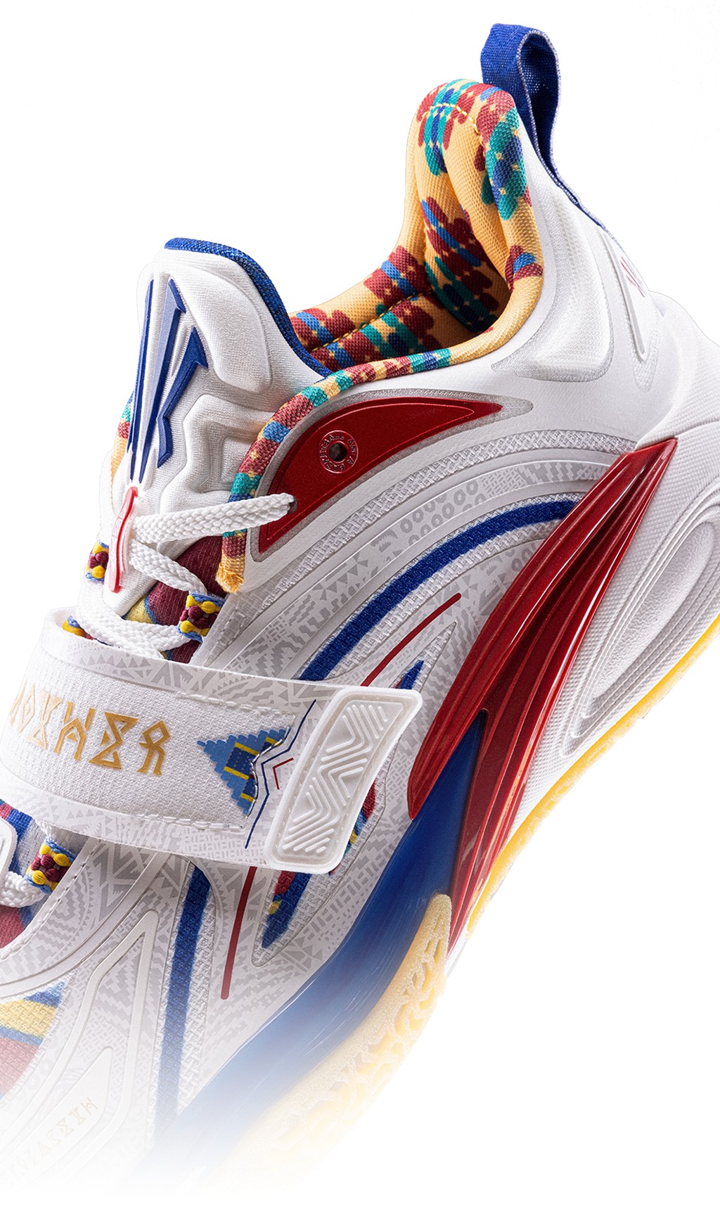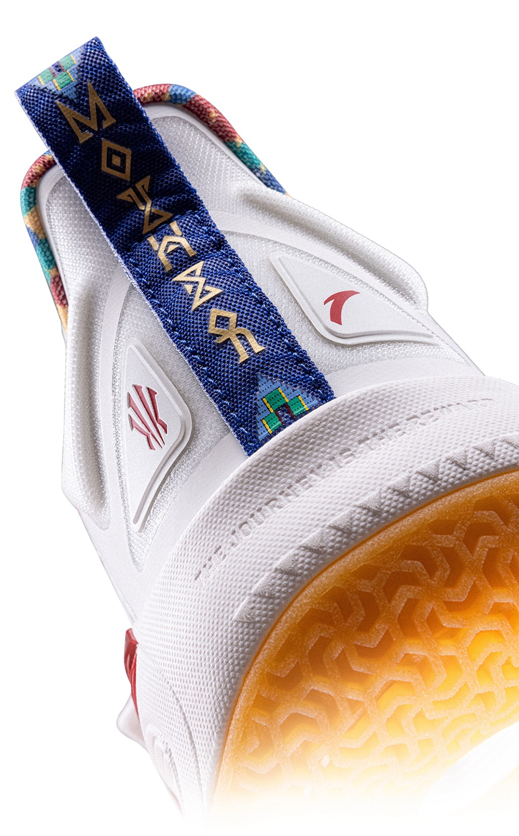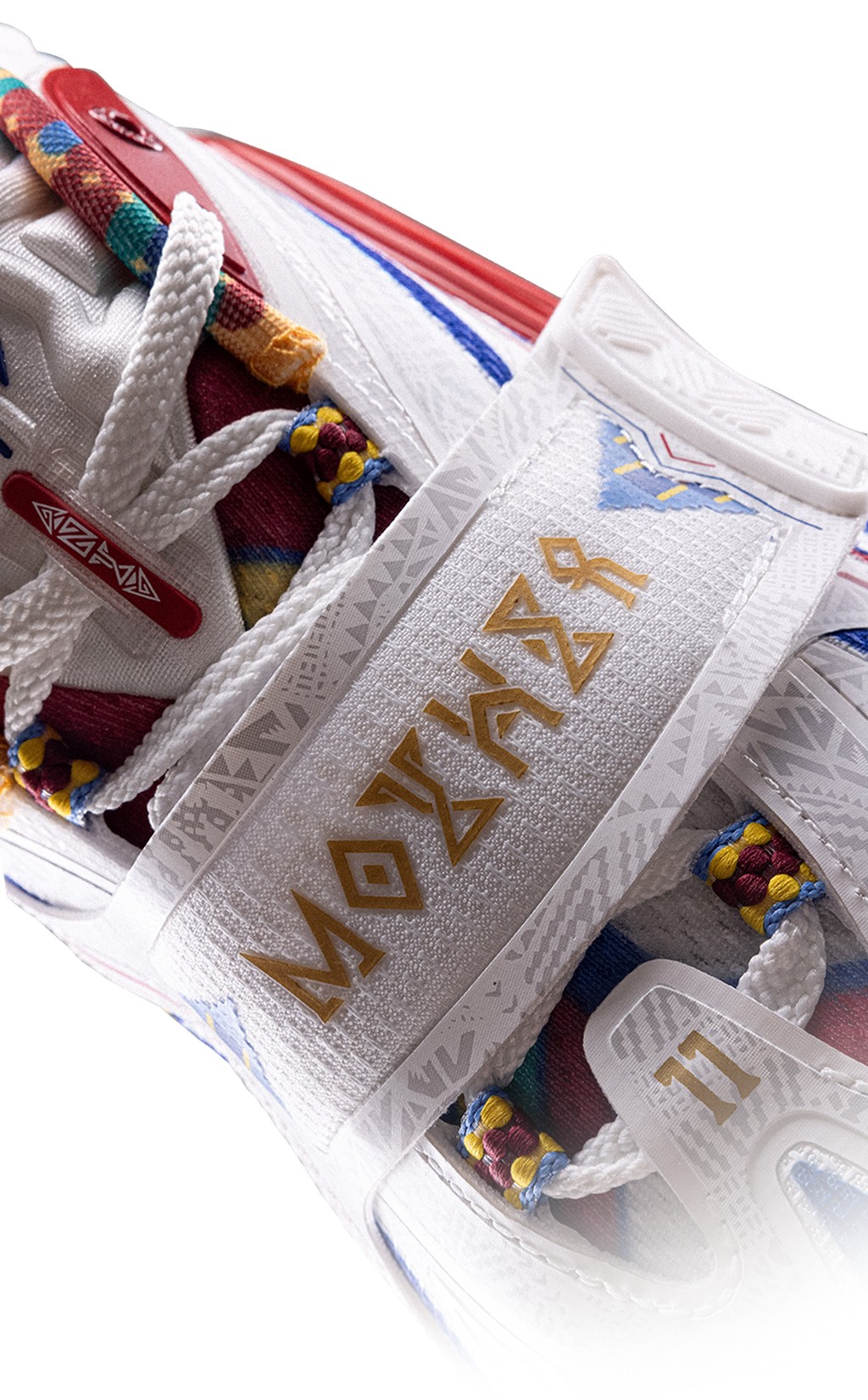 整双鞋的配色灵感,源自欧文为了替母亲追本溯源,皈依立苏岩族部落时穿着的传统服饰。