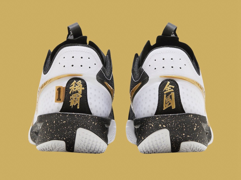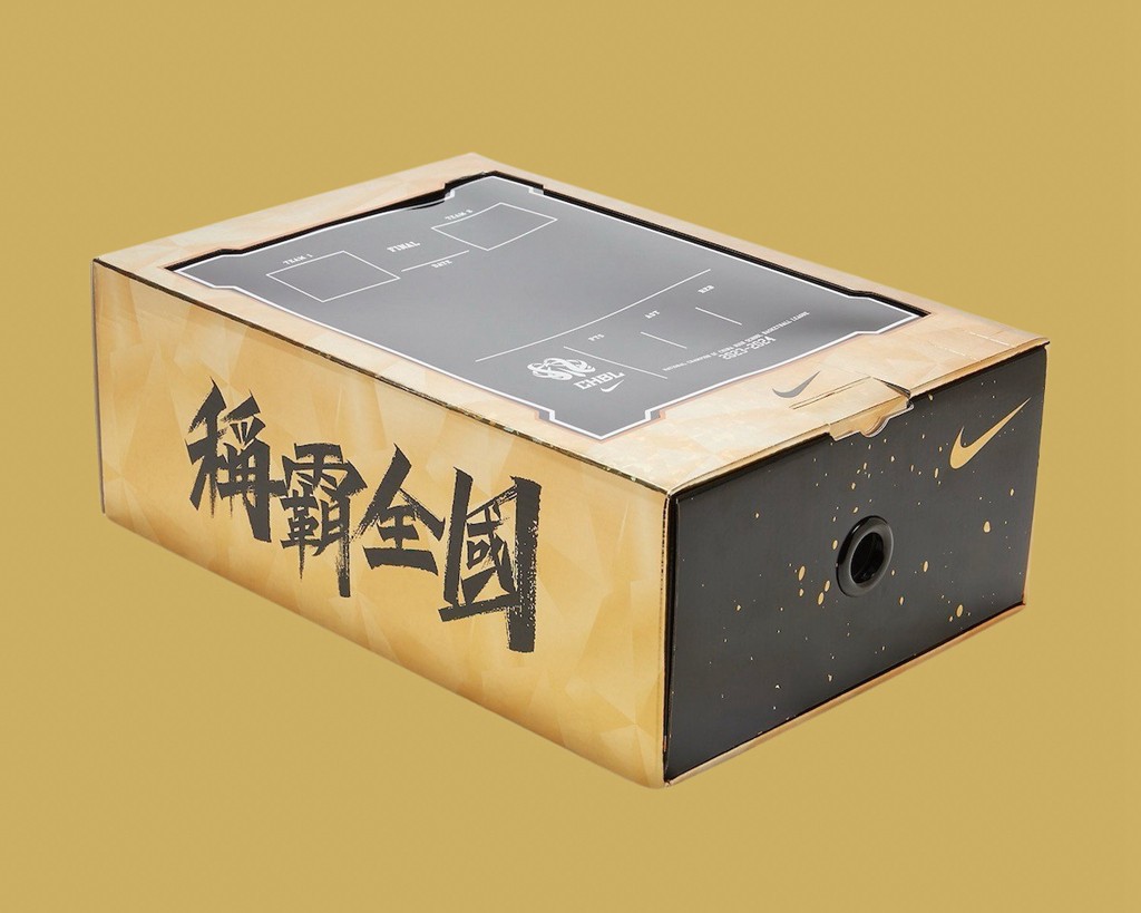 鞋跟后方称霸全国的字样也霸气十足,字体铿锵有力,下方金色泼墨如同夺冠后洒下的金箔。
