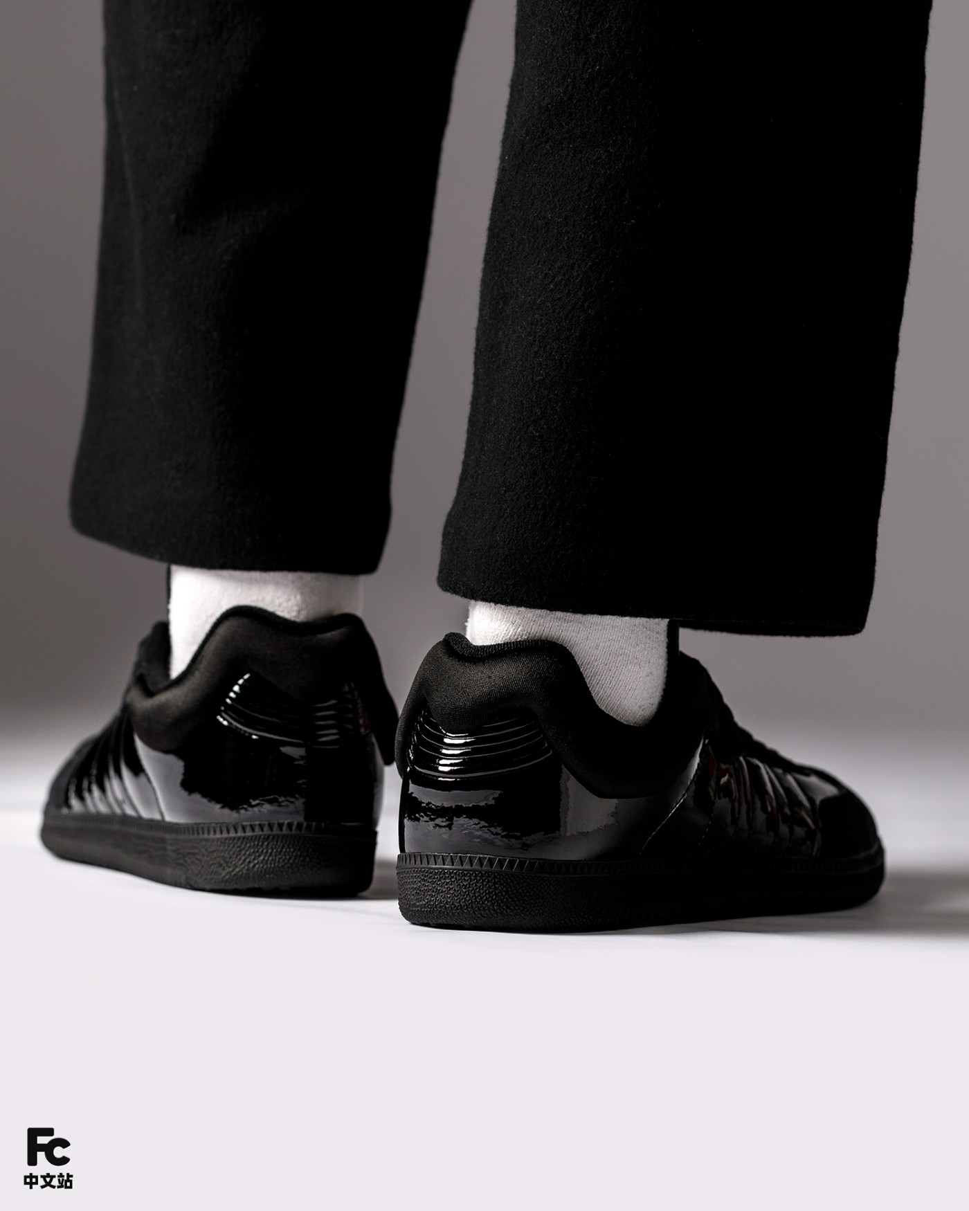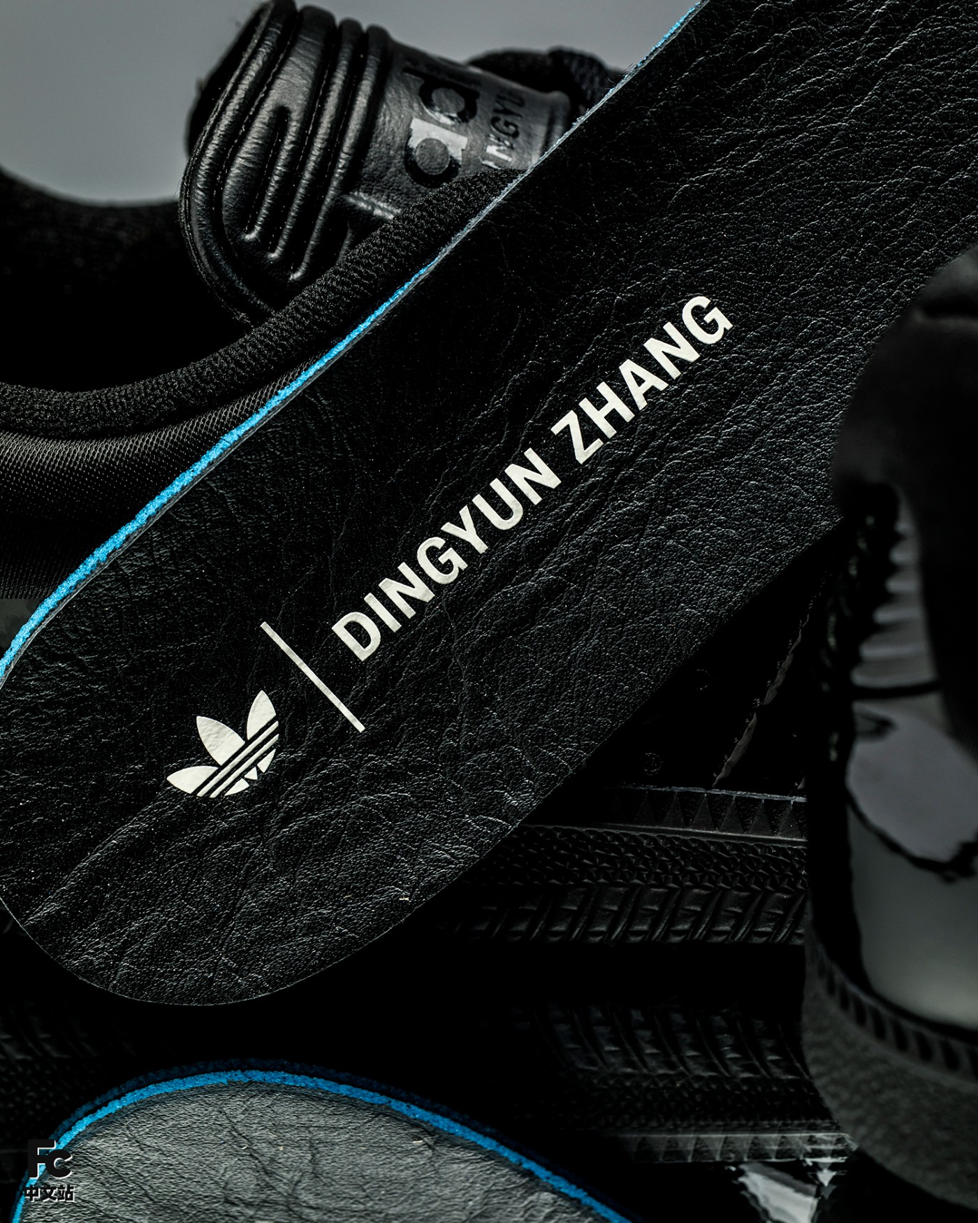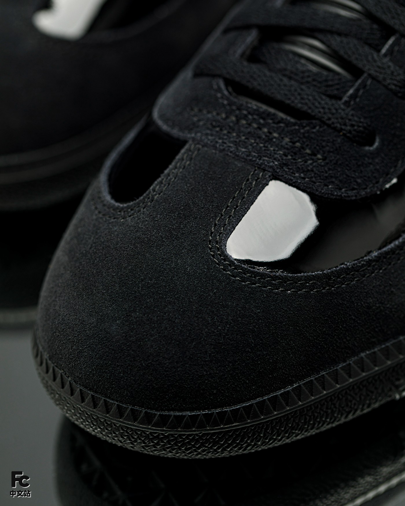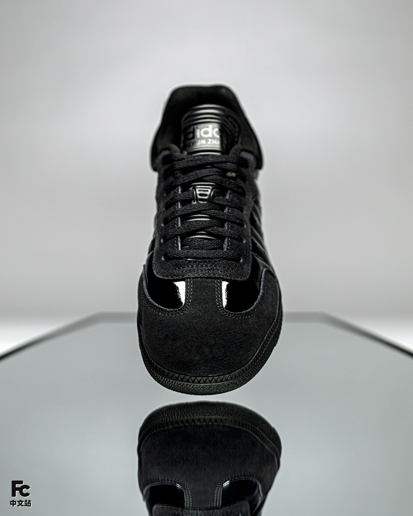 全鞋以纯黑色呈现,是张鼎昀 Dingyun Zhang 对于学生时代的致敬和怀念,上学时为了符合学校的校服着装规范,他曾将自己的 Samba 涂成黑色。